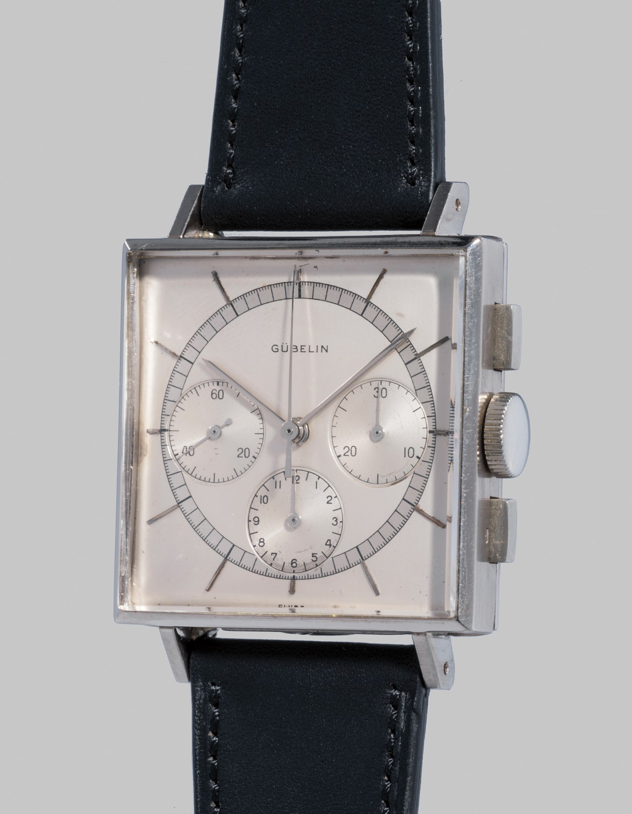 The present lot from the 1950s is a mystery in the sense that we have never seen another Gübelin square chronograph like it on the market. Its vividly contemporary 34mm. X 34mm. white gold case wears much larger on the wrist than the size suggests due to its square shape. The case is in fact quite similar if not identical to the Rolex reference 3529 but larger.