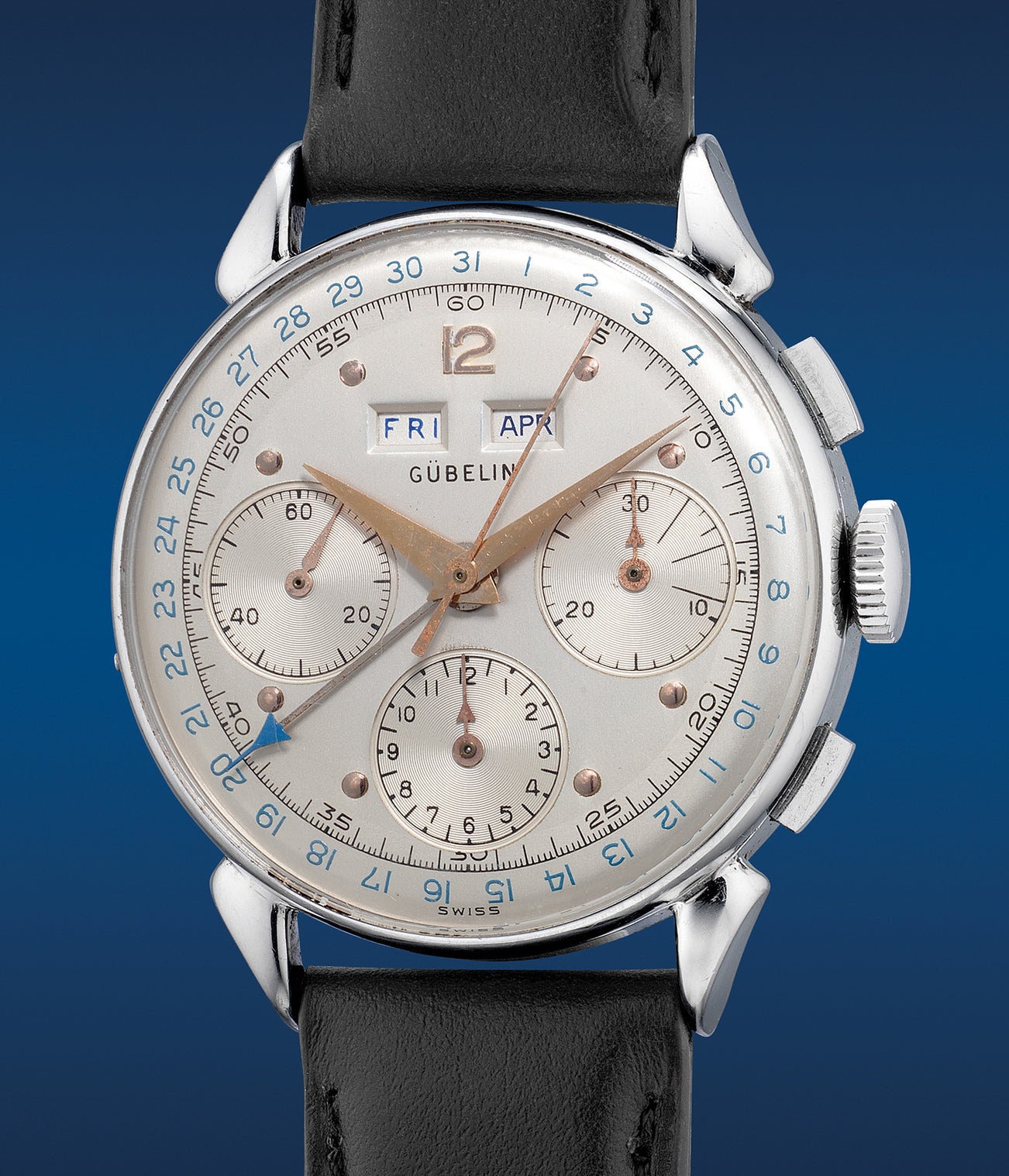 Known for offering some of the most exclusive jewelry and timepieces, Gübelin was founded in 1854 and is still today one of the most important companies in the trade. The present timepiece is a rare and attractive sight. An outstandingly handsome timepiece, it features a triple calendar chronograph function indicating day, month and date via two apertures and its dates indicated by an additional central hand that revolves around an outer track. Presented on a three-tone silver dial with blue accents, the appeal is certainly one that will attractive connoisseurs of fine vintage timepieces. Extremely scarce, this is an example from a small batch of timepieces with its dial, case and movement signed by Gübelin.