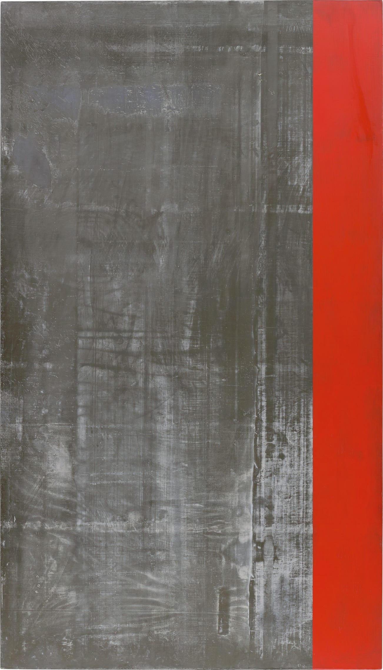 Towering high above the viewer’s eye, Untitled, 1990, is a particularly vibrant example of Günther Förg’s exhaustive series of Lead Paintings, developed in the late 1980s and completed in the early 1990s. In these works, Förg juxtaposed acrylic and lead on flat wooden supports, revealing the tonal and textural variations deriving from the metallic material’s progressive oxidisation. Focusing on the formal abilities enabled by the metal, Förg circumvented the tide of figurative painting that was pervading his native Germany in the 1980s; instead, he remained attached to abstraction, and the organic processes with which the genre could be achieved. In the present composition, Förg celebrates the charismatic presence of two disparate yet commanding hues: a natural, meandering silvery colour – organically washed out in places – and a deep, cherry red pigment. Untitled was notably highlighted in the exhibition Encounters 2: Günther Förg and Skeet McAuley which took place at the Dallas Museum of Art in 1992, marking the first museum exhibition of Förg in the United States, as well as the inaugural presentation of his Lead Paintings to the country's wider public.