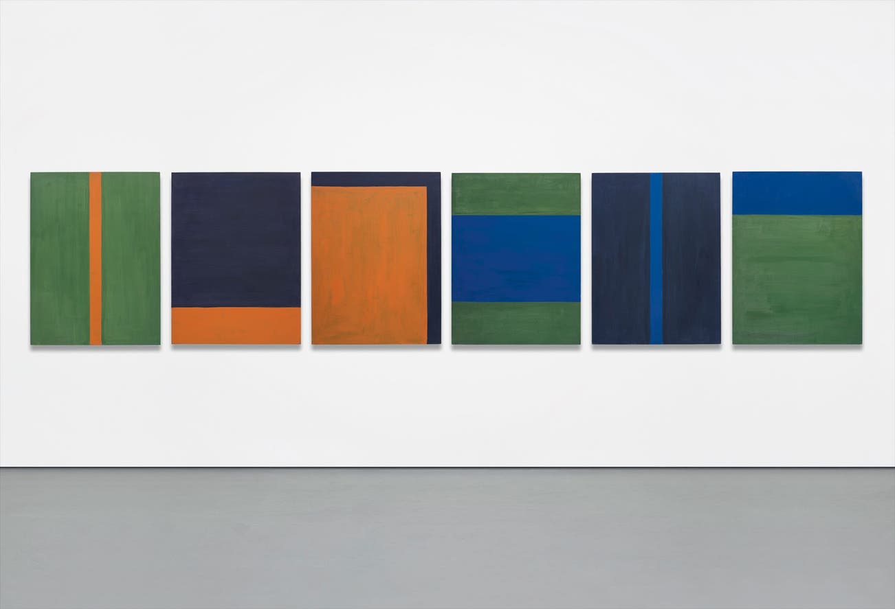 The present lot, a group of six, colorful, minimalist paintings by Günther Förg is a superlative example of the artist’s renowned lead series. Rendered in blue, green and orange, each painting stands alone as a masterpiece. As a group the contrasting vertical and horizontal lines present a comprehensive study of Förg’s most iconic compositions. Lead, as a medium, has become synonymous with Förg, who references Gerhard Richter and Blinky Palermo as his early influencers. The quality of lead, its implied weightiness, stands in direct contrast to the sleek, seemingly weightless compositions. As the artist has explained, “I like very much the qualities of lead - the surface, the heaviness. Some of the paintings were completely painted, and you only experience the lead at the edges; this gives the painting a very heavy feeling - it gives the color a different density and weight.”(Gunther Förg, quoted in David Ryan, Talking Painting, Karlsruhe 1997) The nuances of the lead surface lend a distinct and un-replicable texture to each color and the quality of endless depth to the picture plane. The flatness of the painted forms is remedied by the varying opacity of each carefully selected color pairing. Förg is taking the strict concepts of minimal painters and probing their limits by allowing the effects from his application and the interaction with the lead to proliferate. As a progression of six paintings, the present lot offers a glimpse into the sustained brilliance of Förg’s practice, the simplicity of each composition begs an immediate visual absorption. As he explains, “Newman and Rothko attempted to rehabilitate in their works a unity and an order that for them had been lost. With Newman, one sees that in Broken Obelisk, Stations of the Cross and the design for a synagogue; with Rothko, in his paintings for the chapel in Houston. For me, abstract art today is what one sees and nothing more." (Gunther Förg, in Günther Förg: Painting / Sculpture /Installation, exh. cat., 1989, Newport Beach, p. 6)