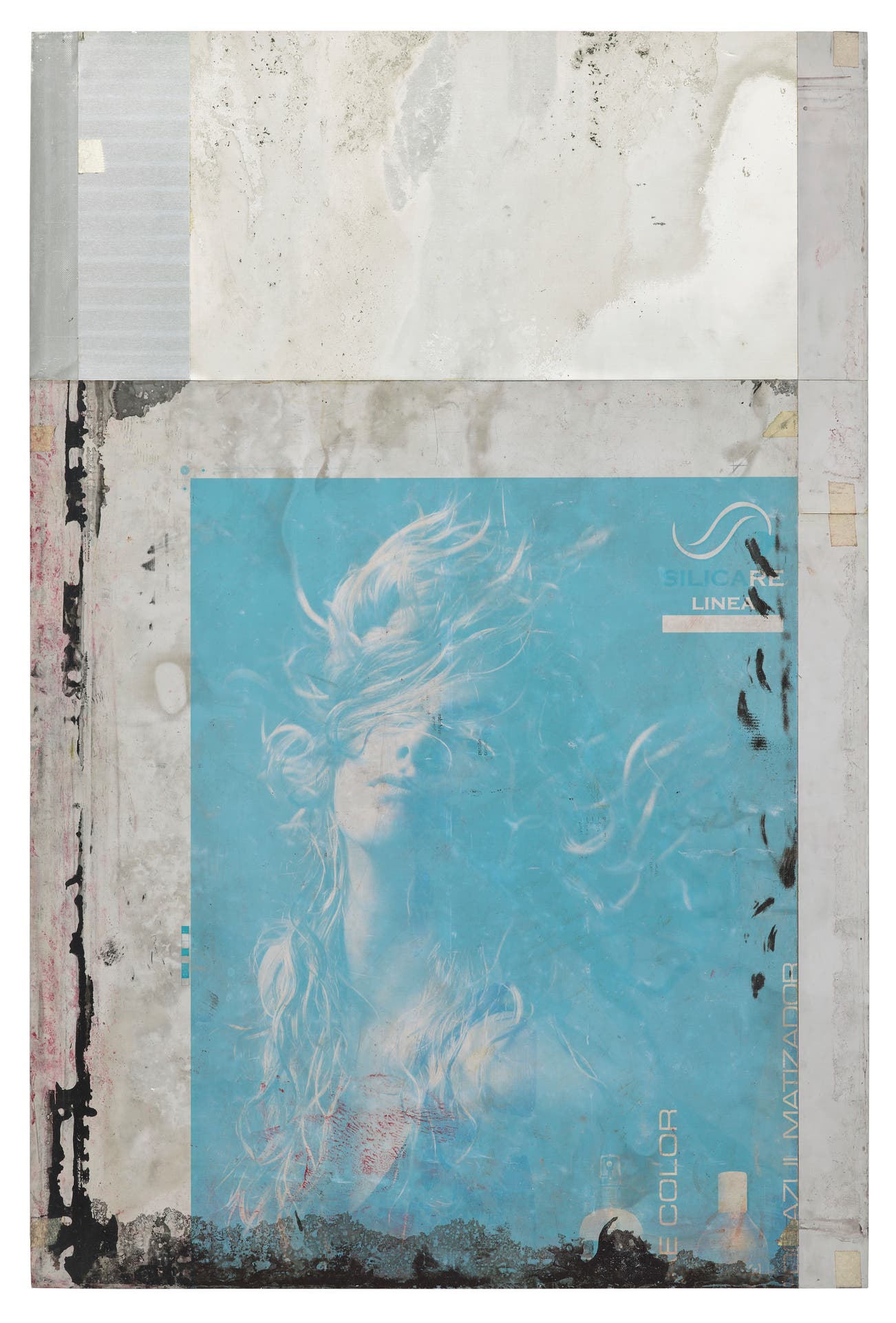 discarded aluminum plate from offset printing press and tape collage, mounted to panel