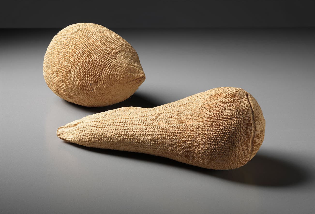 A master at both observation and creative intervention, Orozco encourages his audience to form new imaginative associations between commonplace images and experiences, challenging the traditional concept of beauty as an elevated ideal and incorporating it into the modern reality on the ground. Orozco comments on Two Socks, “Like everyone, I had odd, unmatched socks. Suddenly I realized that I had a connection with the infinite through those socks. They belong, we could say, to a sort of blown-up cosmos, full of odds and ends.” While living in New York the artist decided to create the piece after seeing an episode of British television show Mr. Bean. The artist filled his socks to the point of inflation with papier mâché, until they came to resemble gourd-like objects. Of the production process the artist recalls: “The way in which they are made is the most interesting thing about them. I got the idea to make this piece—separate from all of my amateurish metaphysical meditations—from watching Mr. Bean on television one day. There’s a scene in the park where he’s brought everything he needs to make his lunch, a sandwich. He takes out an immense jar of mayonnaise, an enormous pickle, and an entire bag of sliced bread. He takes out two heads of lettuce and goes over to the water fountain and washes them. Then he takes off a shoe and throws it to the side. He takes off his sock, stuffs the lettuce inside the sock and begins to shake it; this was drying the lettuce. Then he takes the lettuce out of the sock and puts it on the bread, finishing the sandwich. I was laughing at the scene and wanted to play as if I were Mr. Bean. So I filled my sock with papier mâché and I put it out to dry, too.”