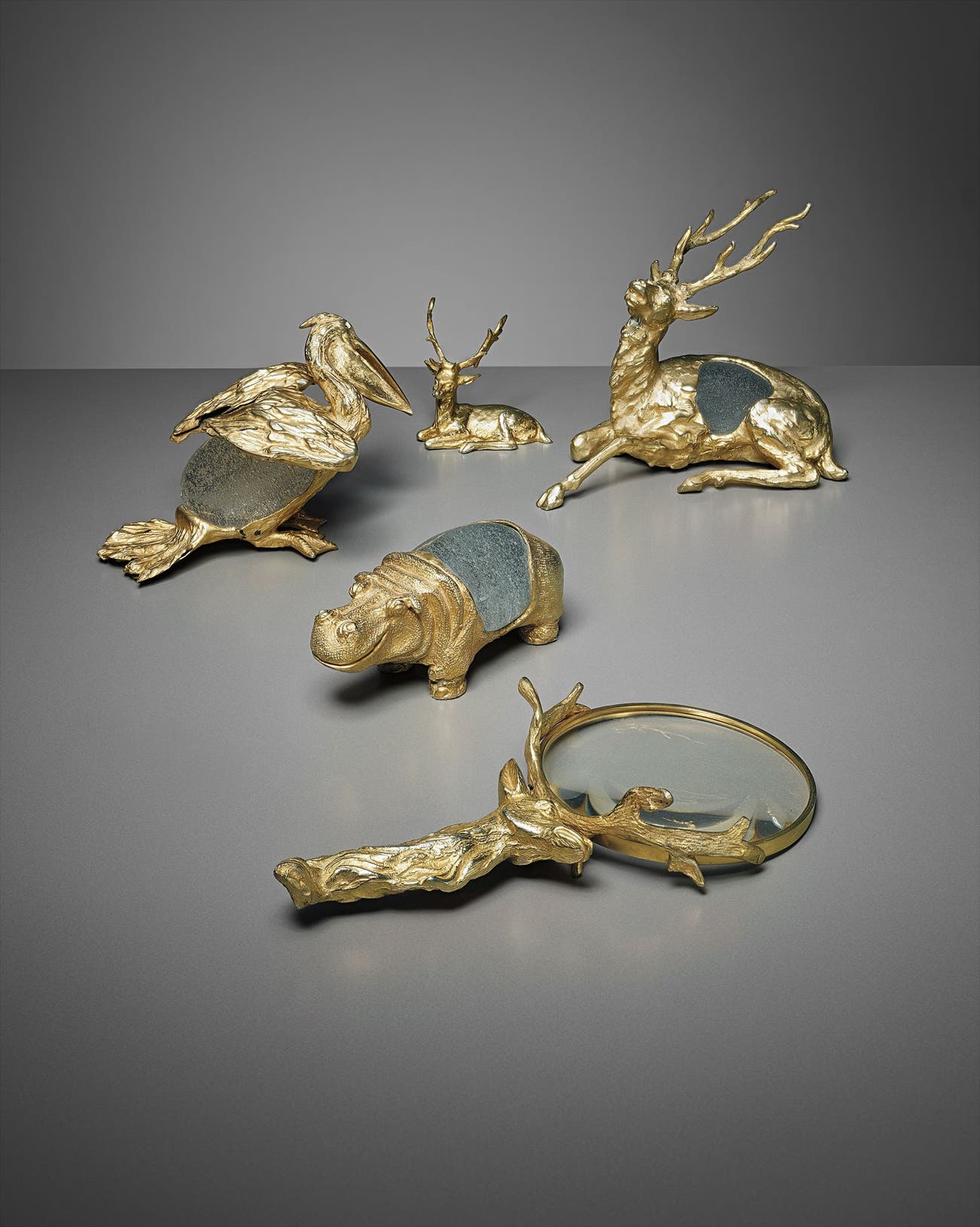 Produced by Gabriella Crespi, Milan, Italy. Glass produced by Barovier & Toso, Murano, Italy. Hippopotamus, Pelican, and Reindeer magnifying glass with plaque impressed with facsimile signature Gabriella Crespi. Stag and Reindeer underside impressed with facsimile signature Gabriella Crespi.