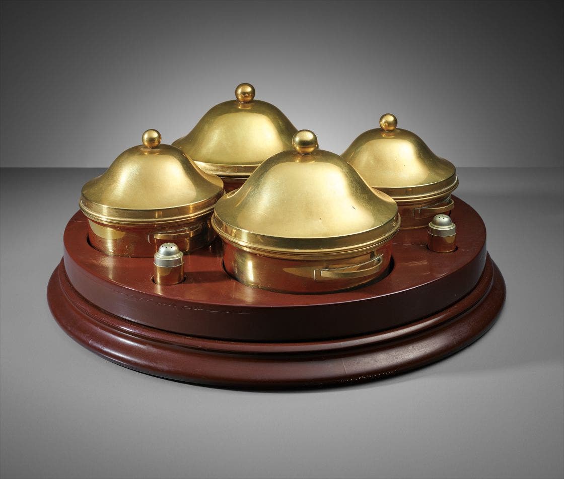 Painted wood, brass, nickel-plated brass, glass, aluminium.