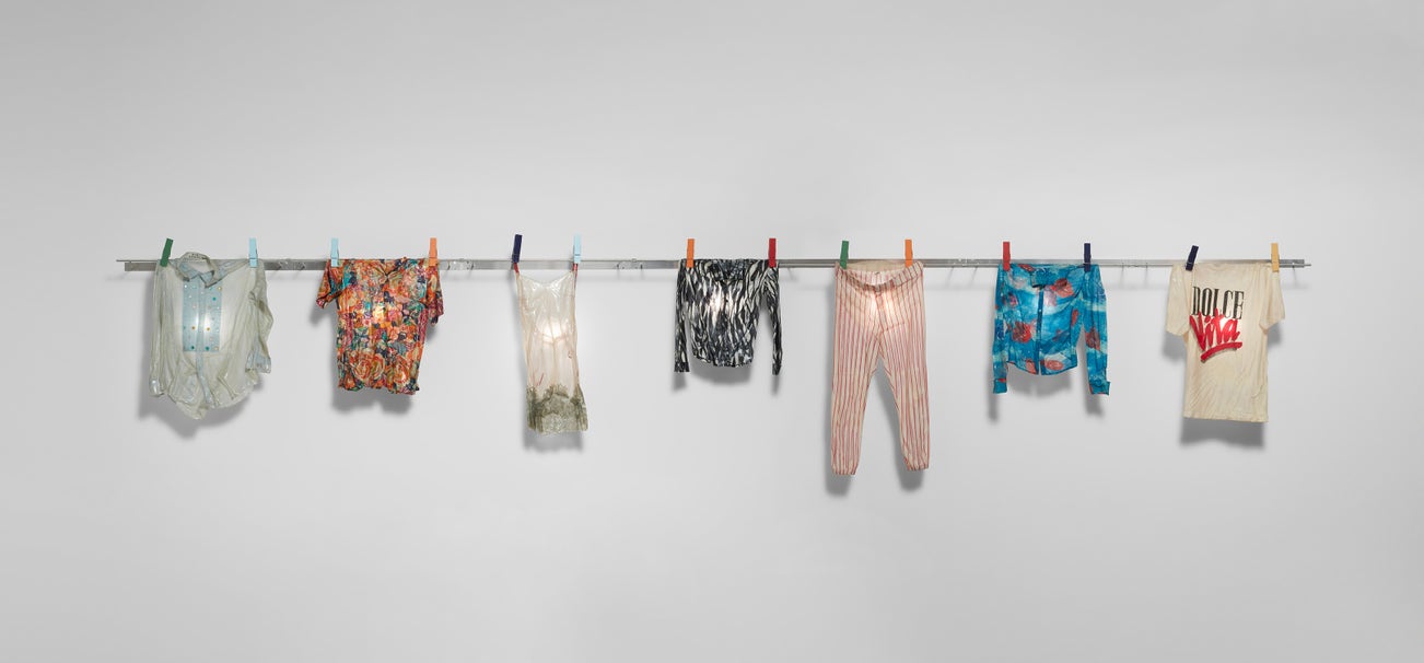 In 2003, Italian designer Gaetano Pesce designed the interiors of Il Cestello, a restaurant in Florence, Italy. Like pieces of drying laundry, the present wall lights hung from a metal bar along the walls of the restaurant. Pesce created the lights by coating pieces of fabric—from a negligee to a pair of baseball knickerbockers to a t-shirt—with resin and then backlighting them. Though the lights were arranged in a row, each piece of clothing is a discrete light, and they can be arranged in various compositions. Like much of Pesce’s work, there is a playfulness to the wall light’s design as well as a completely unexpected and novel use of materials and forms.