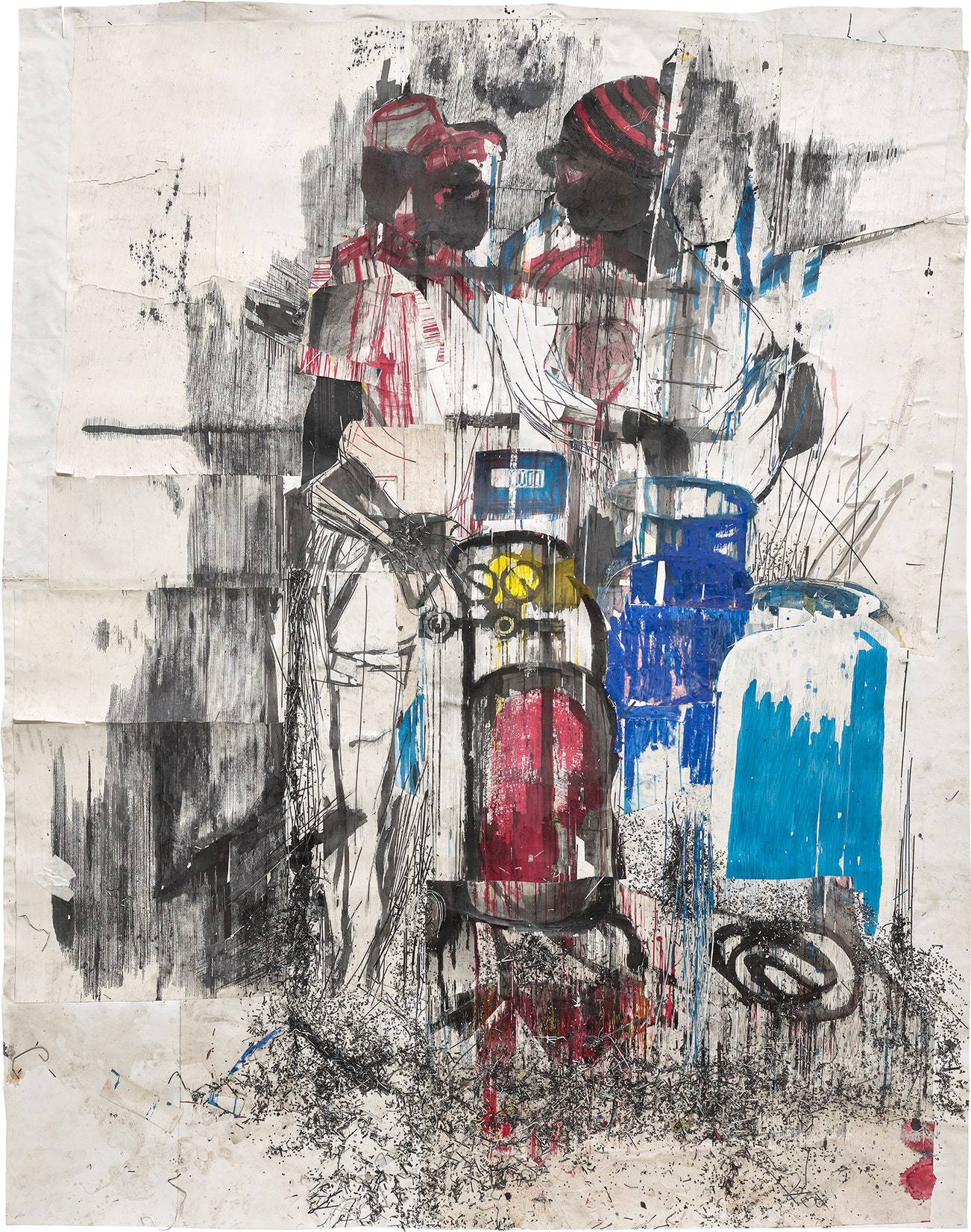 ink, oil and oil pastel on paper collage on unstretched canvas