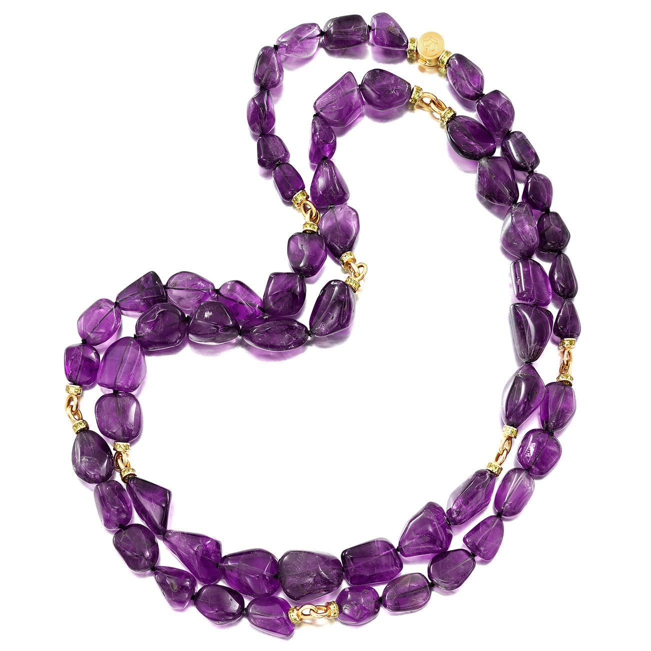 Comprising two strands of tumbled amethyst beads, accented by calibre-cut peridots, mounted in 18K yellow gold, lengths approximately 26 inches and 32 inches, one necklace signed, with maker's mark.