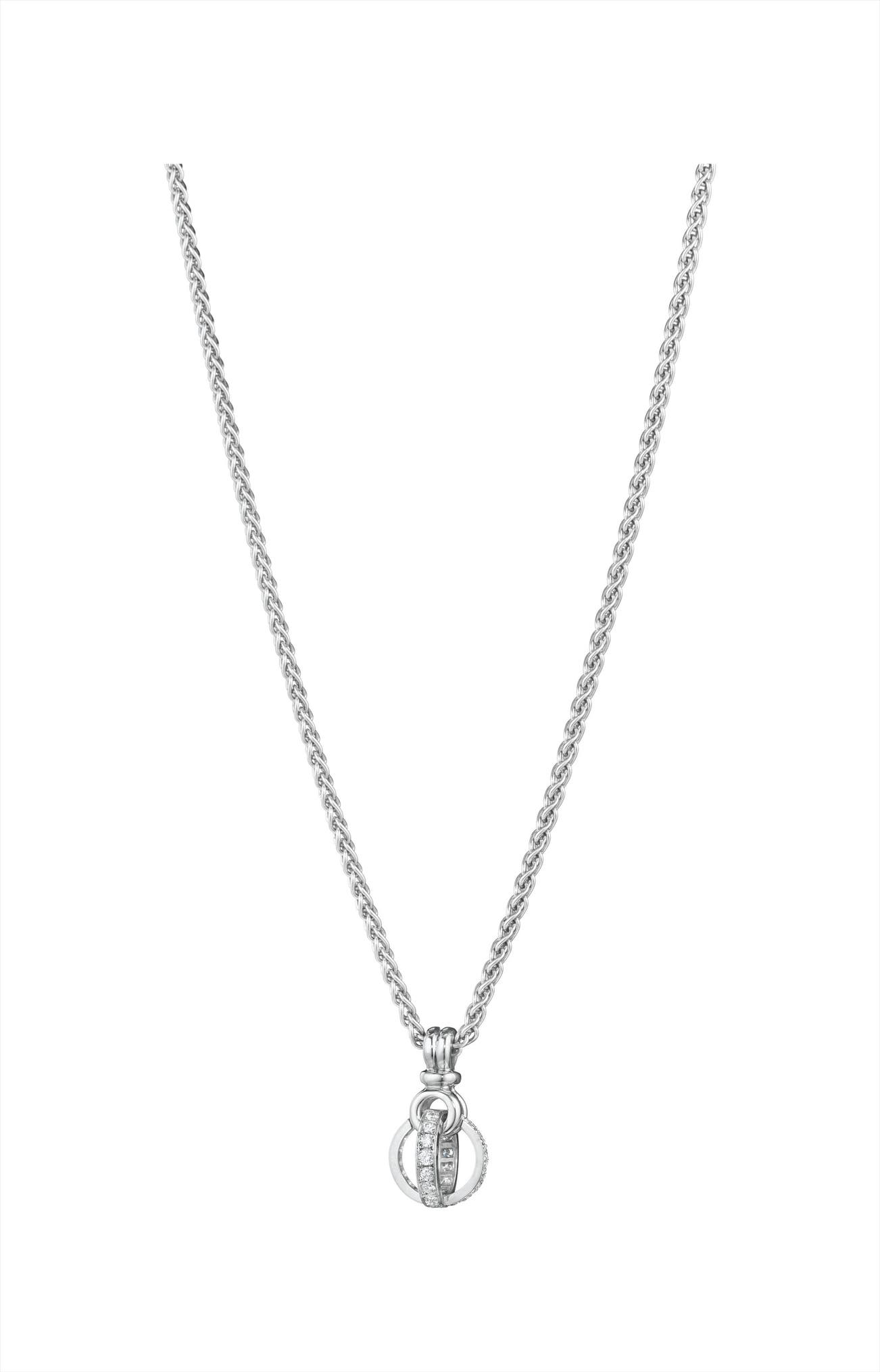 Suspending an open spherical pendant enhanced by circular-cut diamonds from a gold wheat chain, mounted in 18K white gold, length 16 inches.