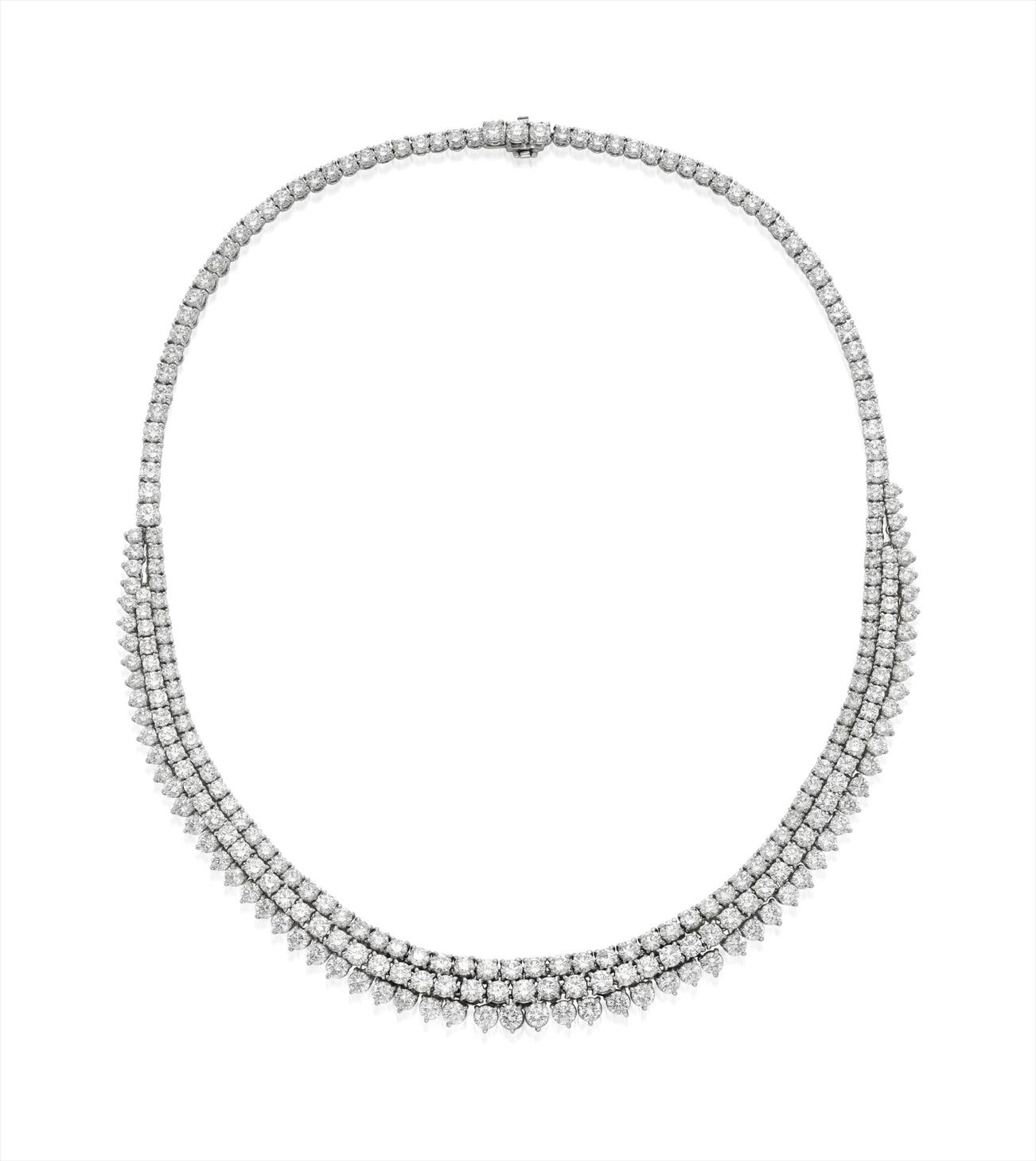 Designed as a series of graduated circular-cut diamond lines, mounted in platinum, length 17 inches.