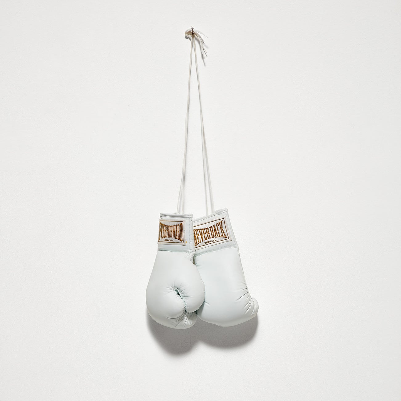 Pair of white leather boxing gloves with metallic gold thread and satin.