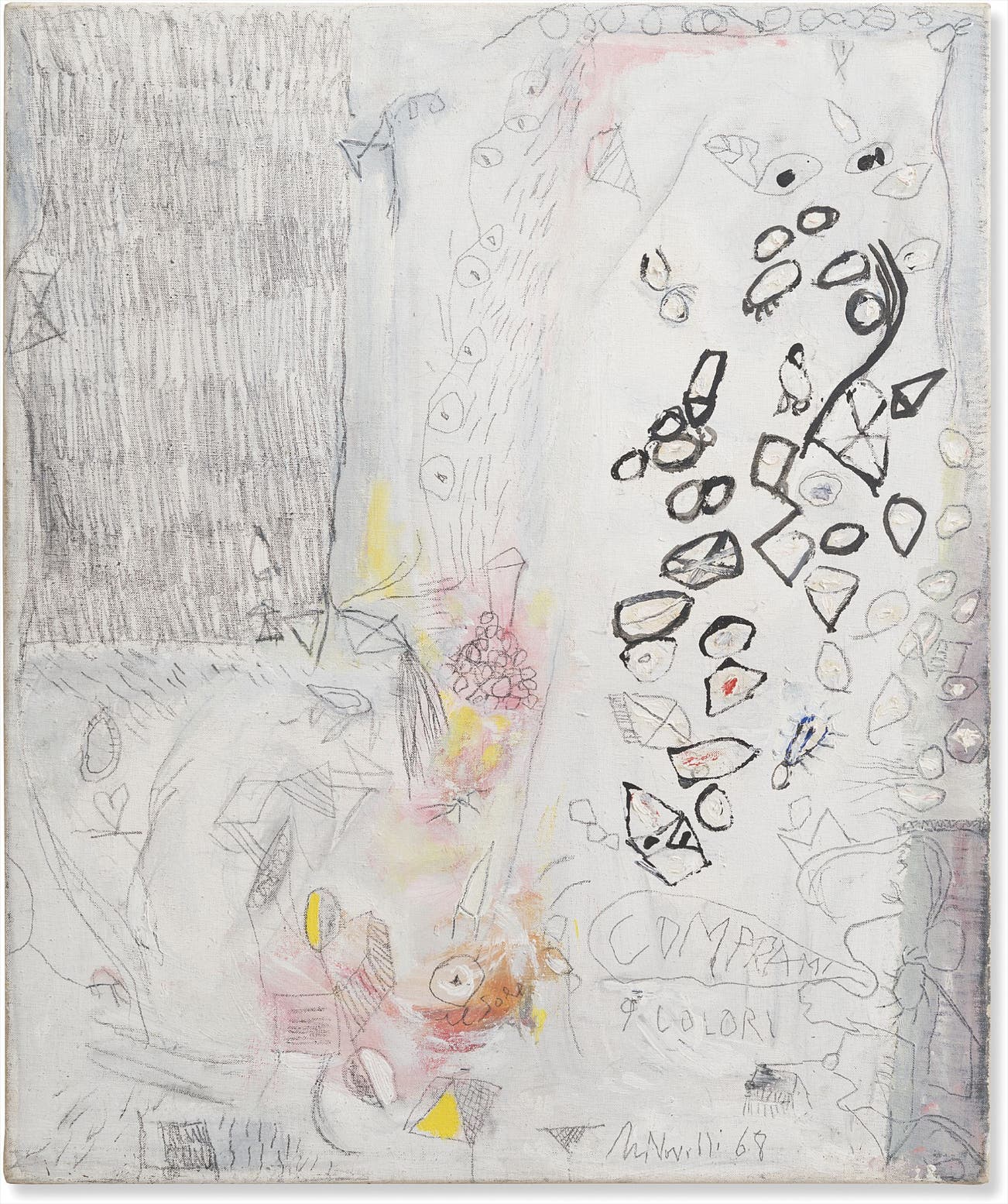 Signed, titled and dated "9 Colori Novelli 68" lower right.