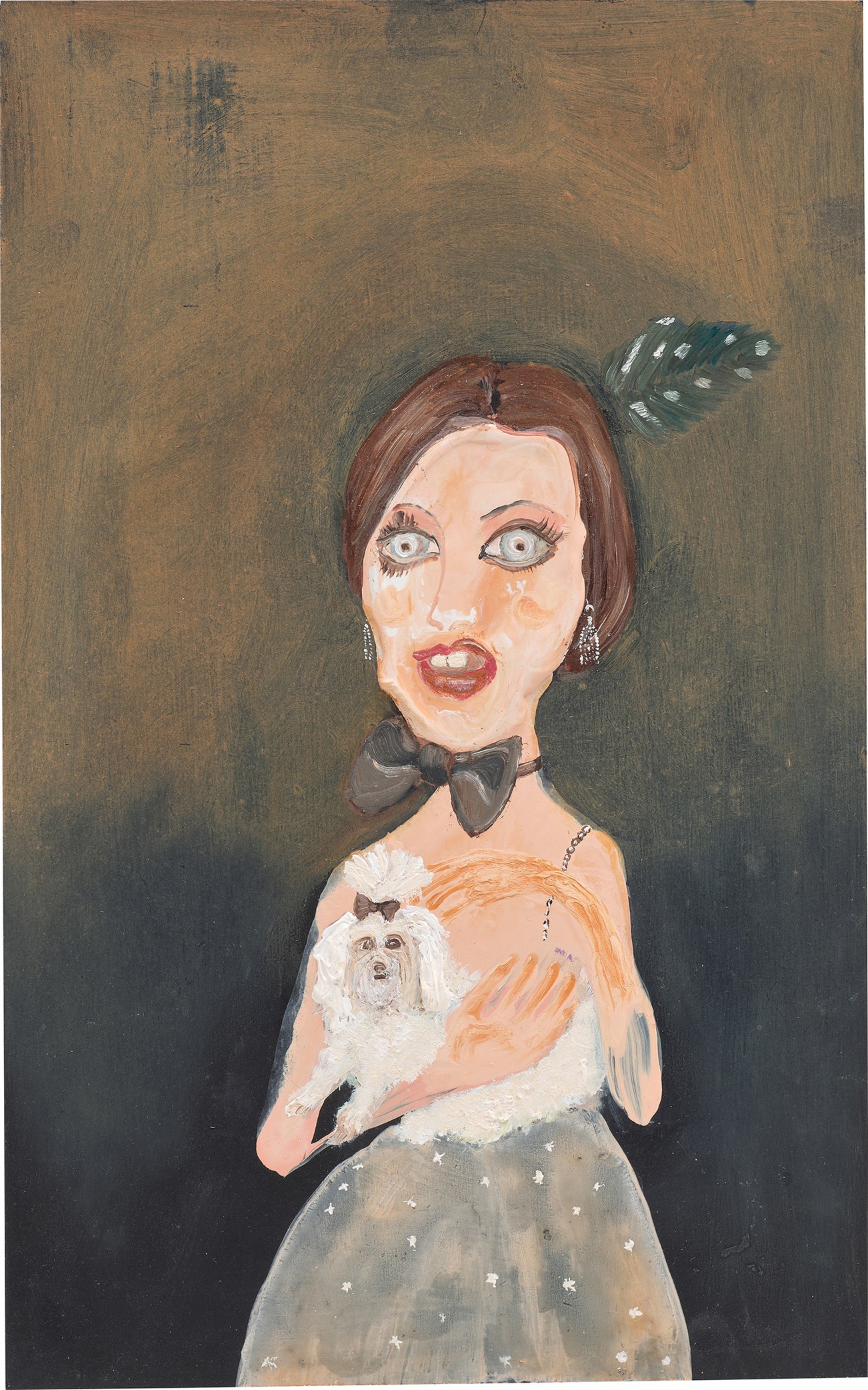 With Lady with a Dog, Figgis plays with the line that separates figuration from abstraction. Set against a subtle gradation of browns and blacks, and rendered with approximate, moody brushstrokes, the eponymous lady exudes an air of uncanniness, whilst simultaneously radiating the splendor of her accessorial embellishments. Indeed, Figgis’ aristocratic figures often vacillate between the great and the grotesque: they sport superb adornments, yet grin foolishly and spill over — merging obliviously with their surroundings. In the present work, the titular figure’s body trickles into abstraction, resonating with Riccardo Venturi’s belief that, ‘Figgis’s protagonists seem to appear in trembling reflections, as if in the ripples of a pond after someone has tossed a stone’. (Riccardo Venturi, ‘Genieve Figgis’, Artforum, April 2018, online.)