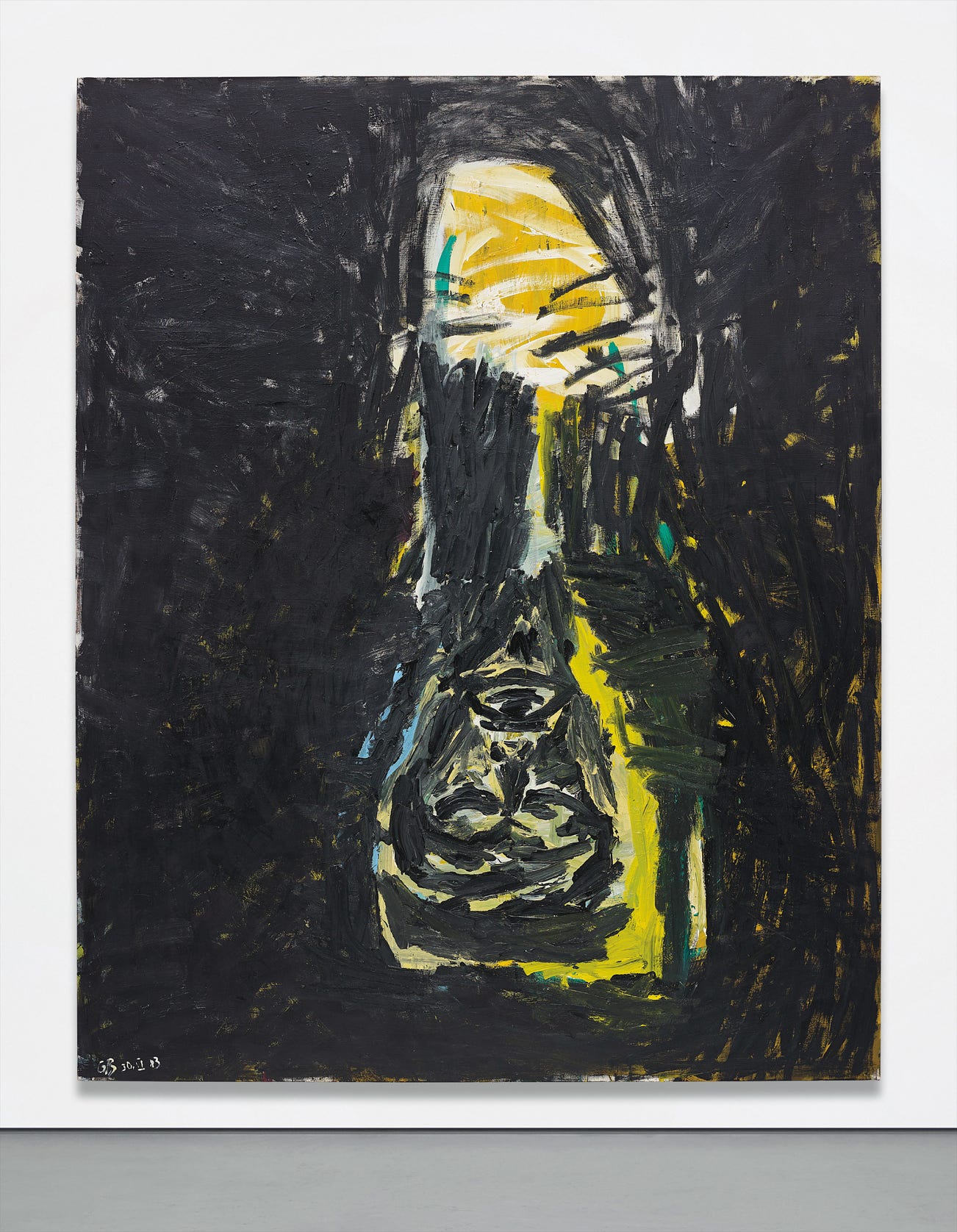Entitled “black column” and characterized by a solidity of form, the present work unmistakably recalls Baselitz’s wood sculptures of the same period. Having created his first major sculpture Modell für eine Skulptur, for the West German pavilion at the Venice Biennale in 1980, Baselitz between 1982 and the spring of 1983 conceived a group of upright figures and heads. Modulated with a chainsaw and axe from a single tree trunk, Baselitz's sculptures are scarred yet defiant, imperfect yet resilient. Like the carved contours of these wooden sculptures, the figure in the present work bears the bold, incisive gestures of the artist’s hand. Imbued with a sense of weight, the figure is roughly modulated with directional brushstrokes that give it a varied and chiseled tactility reminiscent of the irregular exteriors of Baselitz’s contemporaneous sculpture. Seemingly carved from a “black column” of paint, Schwarze Säule, with its elongated yellow idol-like figure, vividly anticipates the yellow-painted Dresdener Frauen sculptures the artist would create some five years later between 1989 and 1990 as a commemoration to the destruction of Dresden at the end of World War II. As such, Schwarze Säule powerfully exemplifies how Baselitz’s radical sculptural explorations pushed his painterly idiom to new levels of ambition.
