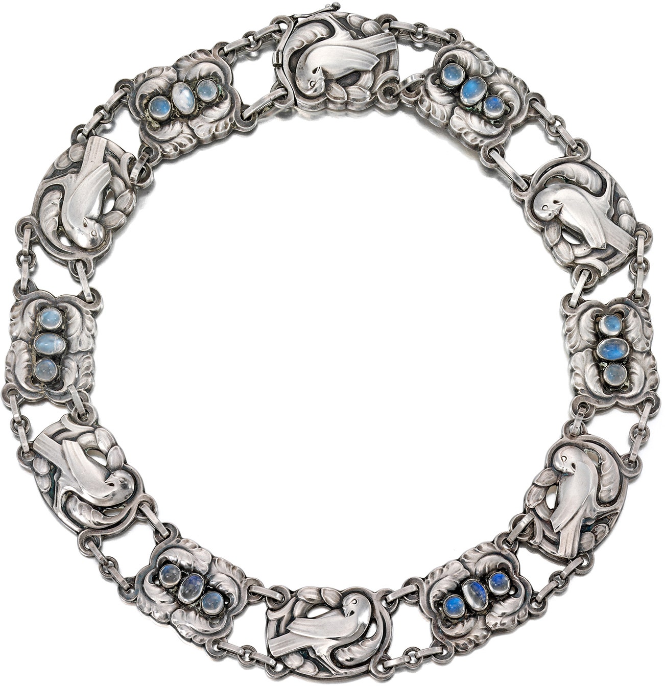 Designed as plaques depicting doves alternating with foliate plaques set with cabochon moonstones, mounted in silver, length approximately 16 inches, signed Georg Jensen, numbered.