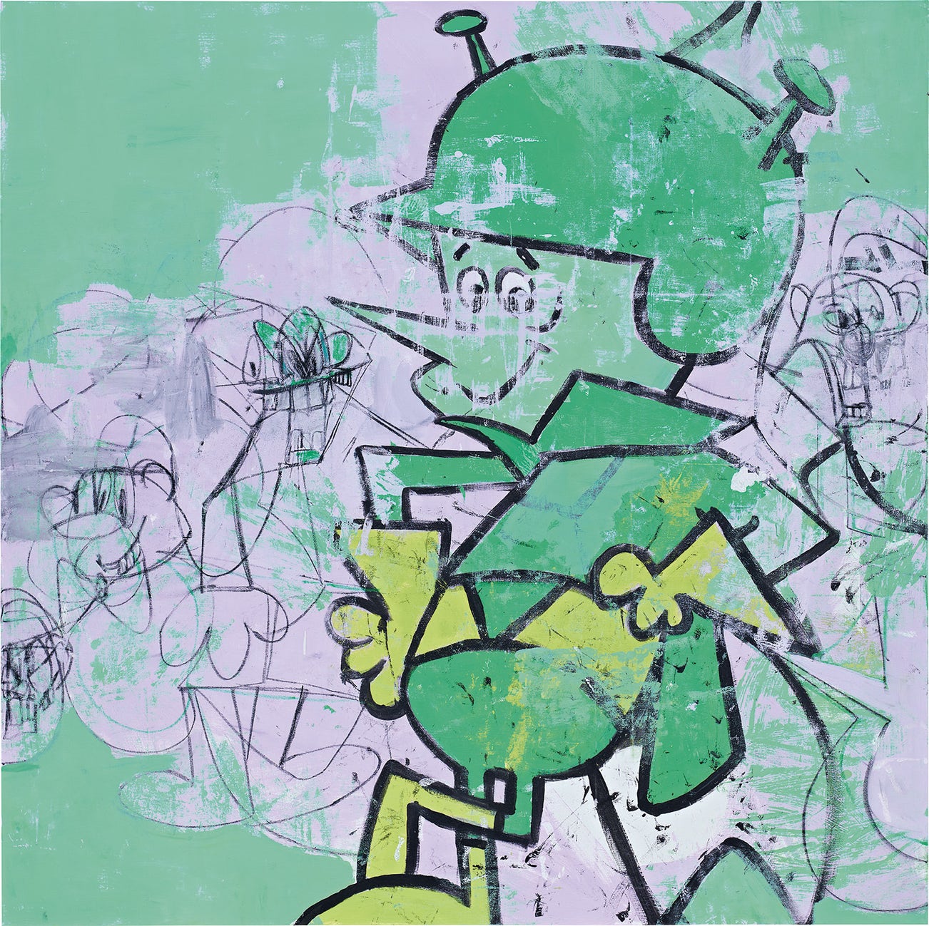 The Great Gazoo is a cartoon character in the Flintstones animated series and part of the body of works entitled Cartoon Abstractions, which George Condo began in 2009. Inspired mainly by Tex Avery, Hanna-Barbera and Looney Tunes characters, in each painting Condo begins by drawing the original outlines of these figures. He then extends these black outlines in order to produce an abstract composition which will cover the remainder of the canvas. Fragmented, subjective depictions of the character drawn from the artist’s imagination blend with the layers of paint, at times appearing clearly or implicitly beneath coloured marks, an improvisation based upon spontaneous use of the paint. Each canvas has its own chromatic palette, drawn directly from the colours associated with the character shown. In the present work, shades of green dominate the composition to match the costume of the little alien. Exhibited as early as in 2010 at the Galerie Jérôme de Noirmont in Paris, the Cartoon Abstractions form a singular but very coherent small group of works in the artist’s career. Condo had already embraced the cartoons theme in depicting Superman and Batman in works from 2005. At play in these works was an acerbic comment on the values of the superhero in today’s society, as well as an underlying analysis of the genre of portraiture itself. In the Cartoon Abstractions series, Condo reflects upon his own practice as well as the age d’or of American soft power, where its cultural history conquered and transformed the world in the 1950s and 1960s.