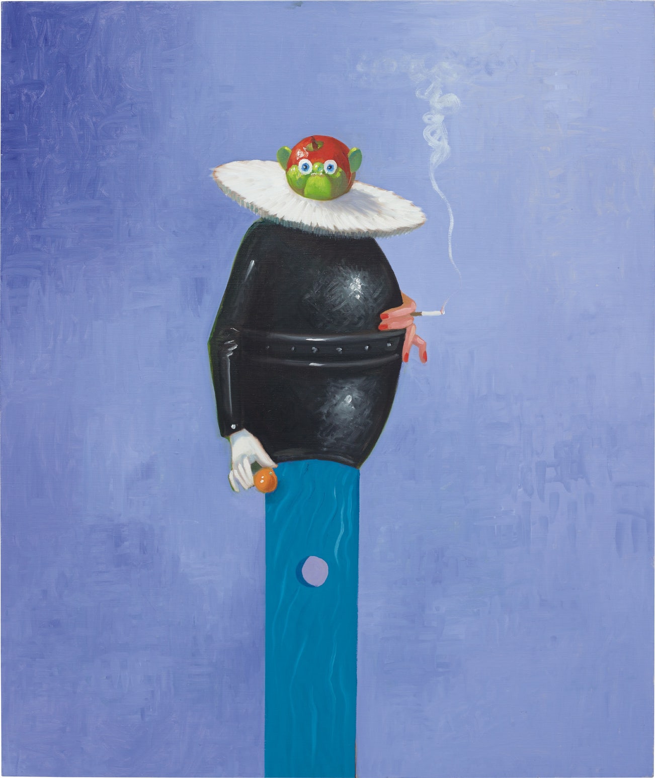 Stanley Steamer (Fat Jim) imagines a typically mysterious sitter. A collection of parts approximates a human form: an apple becomes the head, a metallic barrel the torso, and a wooden plank the legs. One gloved hand holds what appears to be an orange; the other holds a cigarette between painted nails. The posture is strikingly similar to that struck in Skinny Jim, another work from the same year in which a polka-dotted clown holds similar appendages in analogous positions. Yet the two are far from identical; Stanley Steamer (Fat Jim) moves further away from a conventionally recognisable human form. Nonetheless, the artist’s focus is squarely trained on humanity.