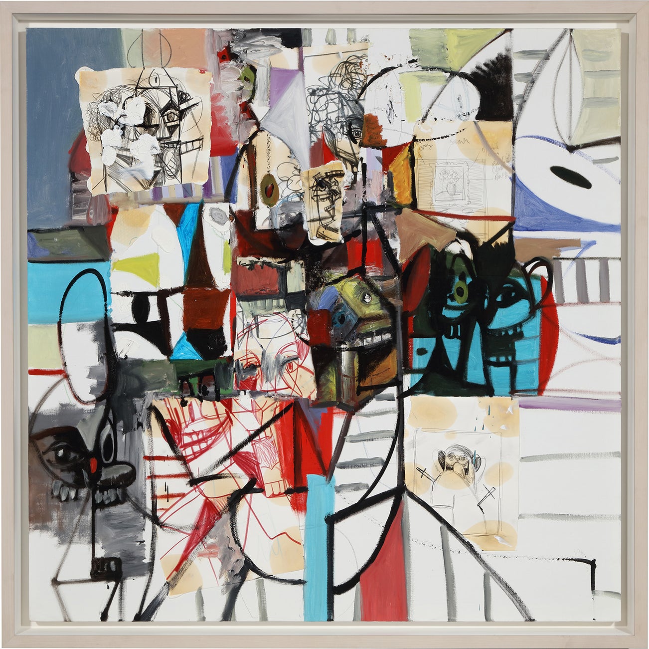 oil, pencil and paper collage on canvas, in artist's frame