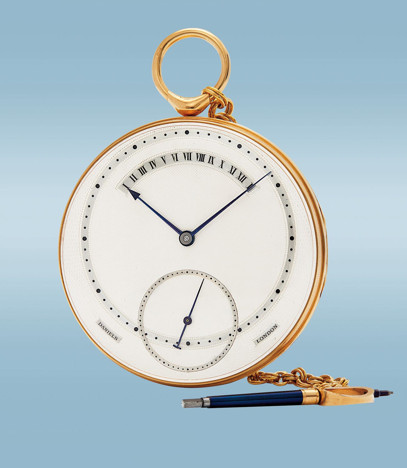 So pleased with his first Daniels watch, Hornby would later ask George for a second pocket watch, with a double wheel chronometer escapement, thermometer and up‐ and‐down indication, delivered in 1977, and now in a private collection.
