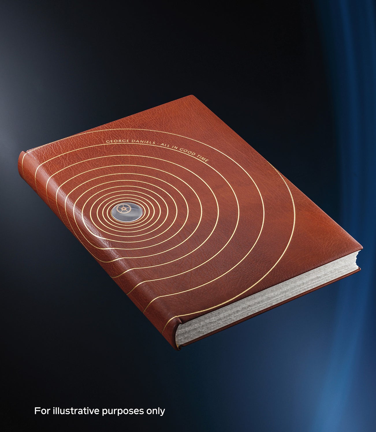 The present tome is a luxurious leather bound limited edition book of George Daniels' autobiography All in Good Time. The cover is in leather, with gold tooling and a recessed panel covered by a glass containing a watch component made by George Daniels.