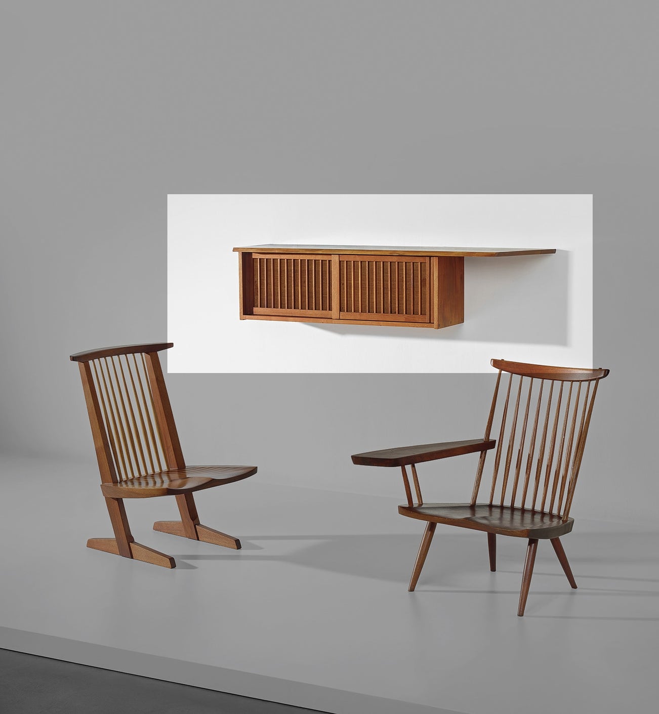 After returning to the U.S. in 1940, Nakashima's family was interned in an American concentration camp, a horrible ordeal that nevertheless introduced him to traditional Japanese joinery by way of a Nisei woodworker he met in the camp. He incorporated these techniques and also drew on American vernacular forms, such as the Windsor chair. These diverse influences have resulted in immense crossover appeal in the world of twentieth-century design collecting.