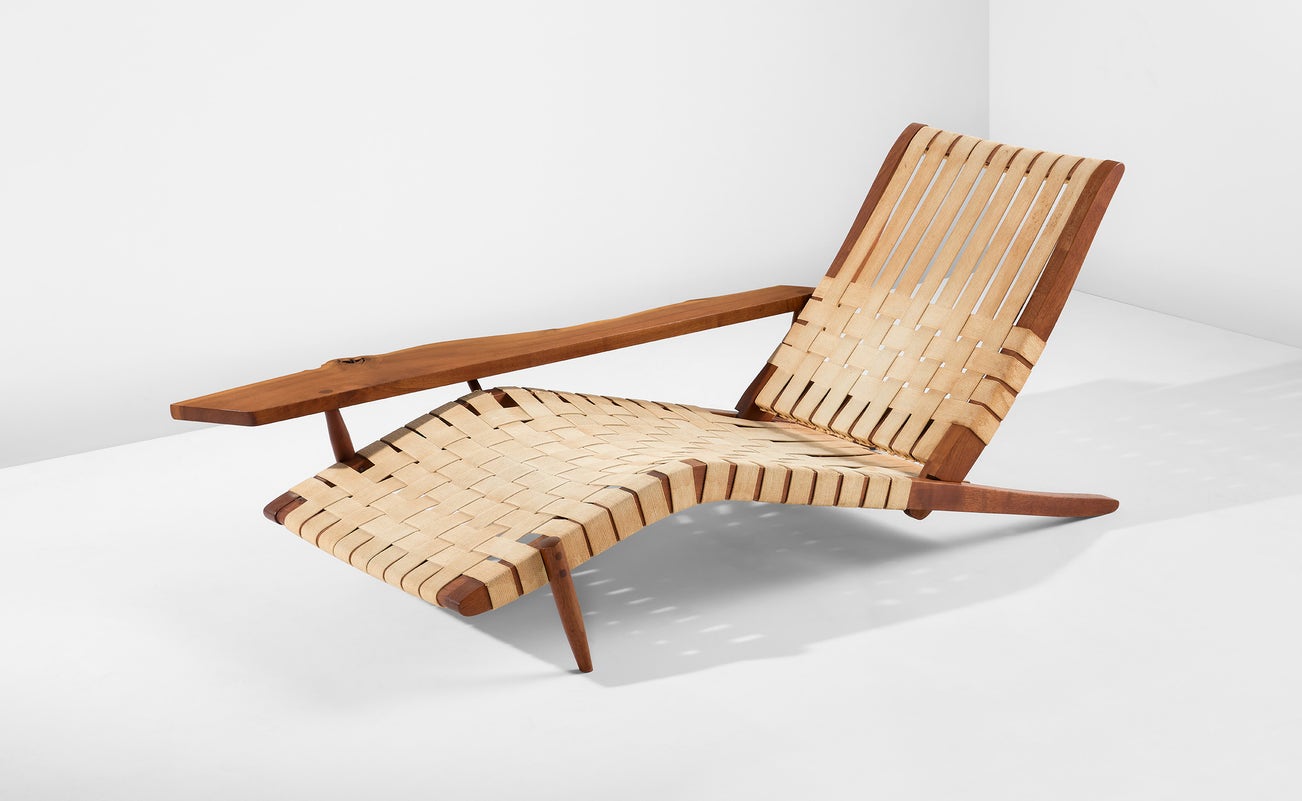 After returning to the U.S. in 1940, Nakashima's family was interned in an American concentration camp, a horrible ordeal that nevertheless introduced him to traditional Japanese joinery by way of a Nisei woodworker he met in the camp. He incorporated these techniques and also drew on American vernacular forms, such as the Windsor chair. These diverse influences have resulted in immense crossover appeal in the world of twentieth-century design collecting.
