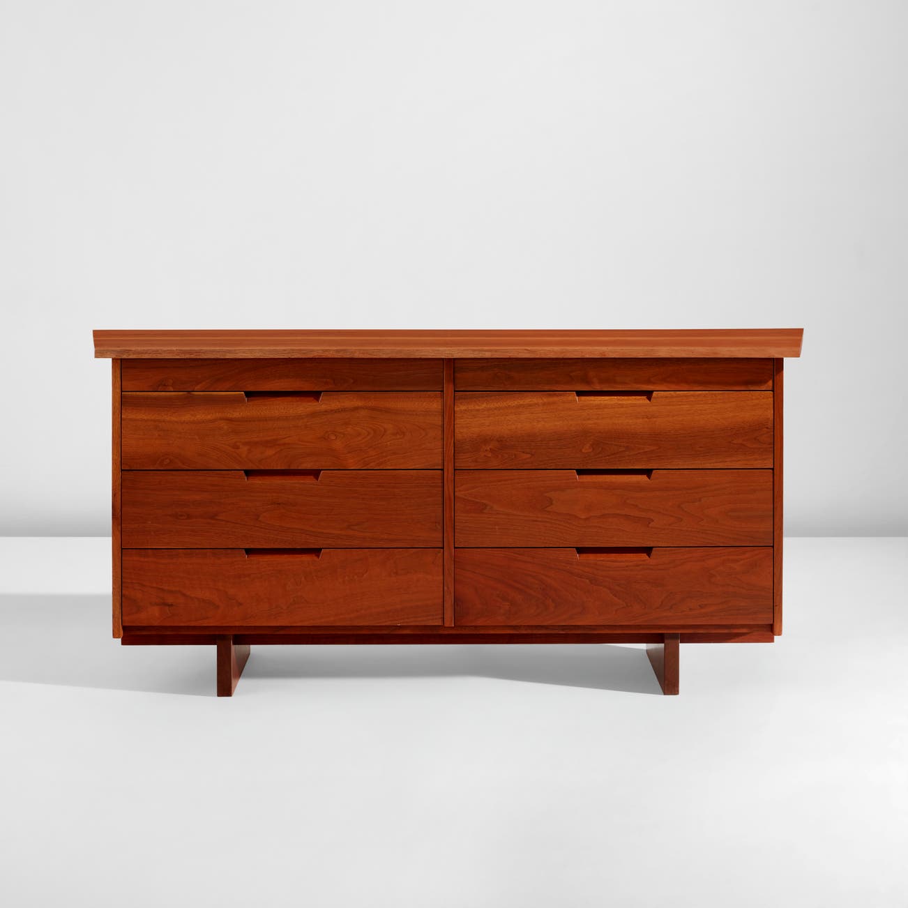 After returning to the U.S. in 1940, Nakashima's family was interned in an American concentration camp, a horrible ordeal that nevertheless introduced him to traditional Japanese joinery by way of a Nisei woodworker he met in the camp. He incorporated these techniques and also drew on American vernacular forms, such as the Windsor chair. These diverse influences have resulted in immense crossover appeal in the world of twentieth-century design collecting.