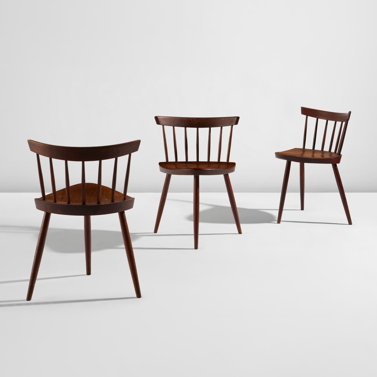 After returning to the U.S. in 1940, Nakashima's family was interned in an American concentration camp, a horrible ordeal that nevertheless introduced him to traditional Japanese joinery by way of a Nisei woodworker he met in the camp. He incorporated these techniques and also drew on American vernacular forms, such as the Windsor chair. These diverse influences have resulted in immense crossover appeal in the world of twentieth-century design collecting.