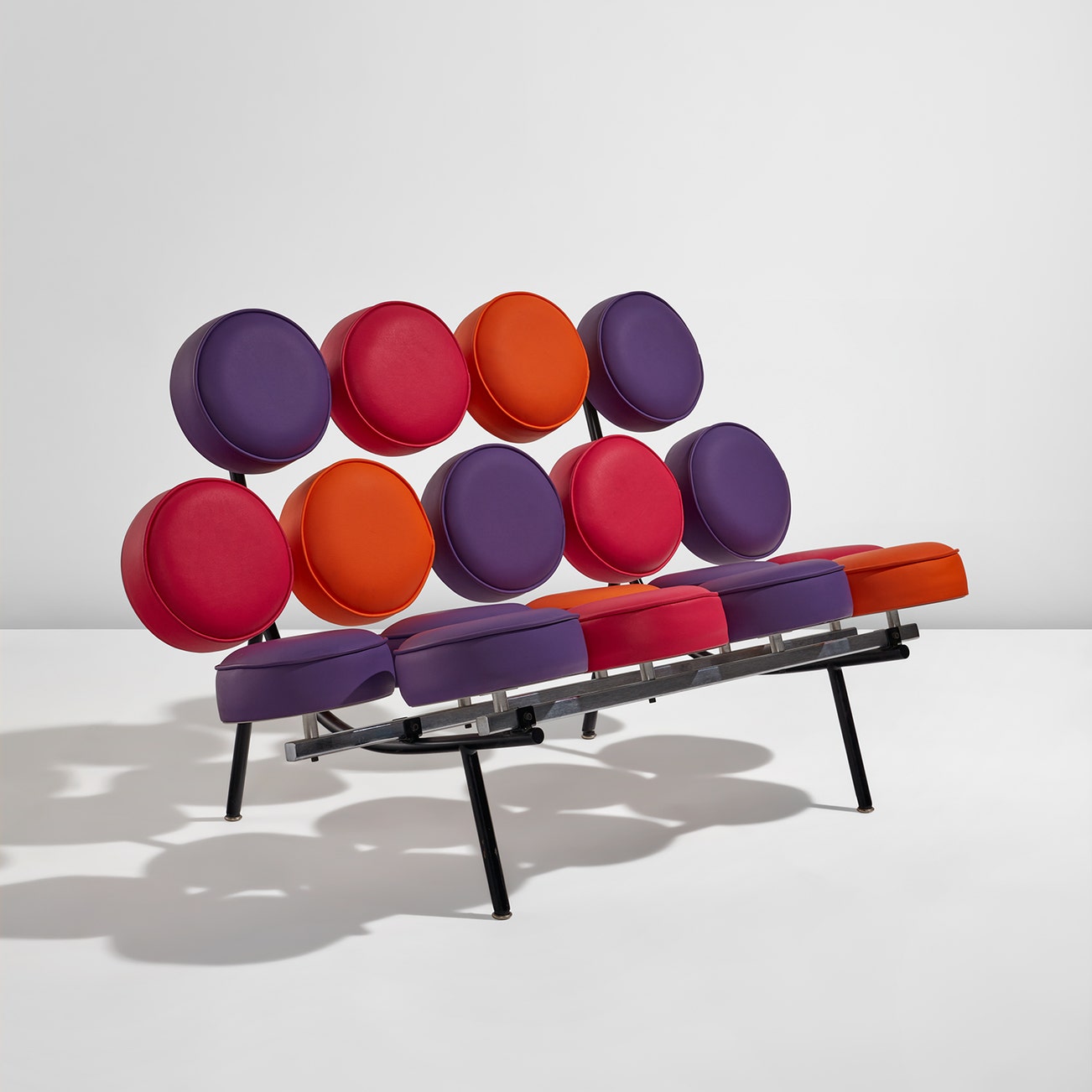 Steel, painted steel, vinyl upholstery.