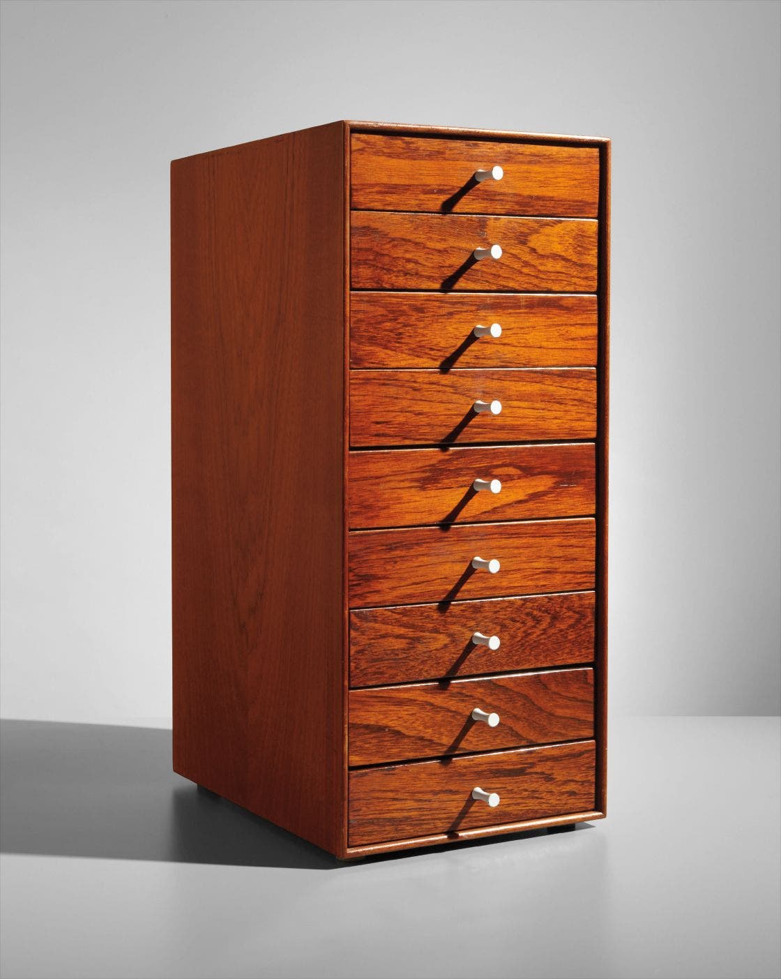 Manufactured by Herman Miller, Zeeland, Michigan, USA. Interior of bottom drawer with metal label printed with manufacturer logo and DESIGNED BY GEORGE NELSON/HERMAN MILLER ZEELAND, MICH. Underside of each drawer with ink-stamped numbers.