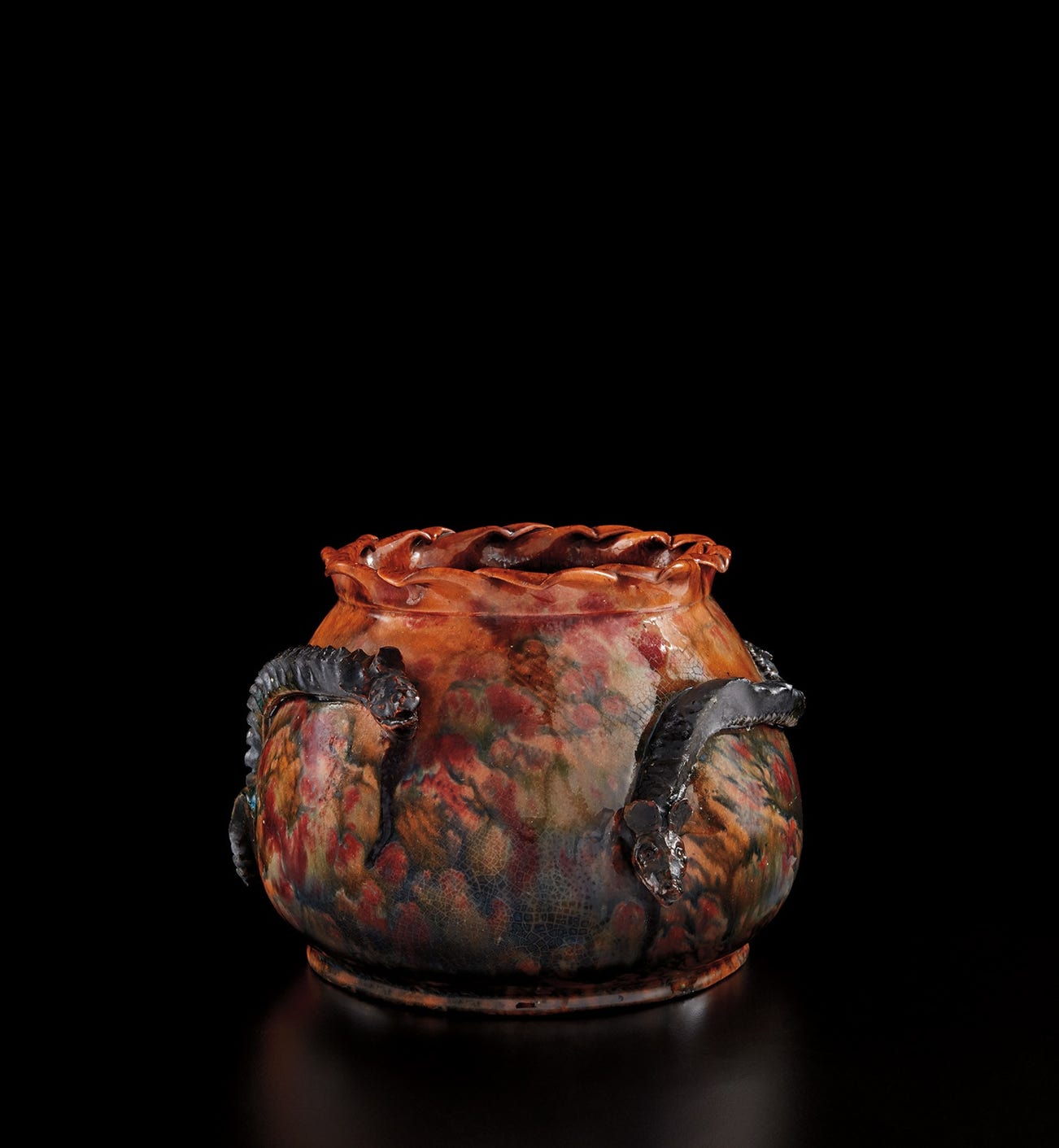 Working out of his studio in Biloxi, Mississippi, George Ohr created untraditional forms that twisted and contorted in unexpected ways. He also experimented greatly with glazing techniques, such as his blistering effect in which he purposefully burst glaze bubbles to produce a scaley and delicate surface texture. While Ohr has been characterized as an idiosyncratic and eccentric outsider artist, he also received ample exposure to the innovations of his international contemporaries at exhibitions such as the The World’s Columbian Exposition which took place in Chicago in 1893. Ernest Chaplet and Pierre-Adrien Dalpayrat were both in attendance.