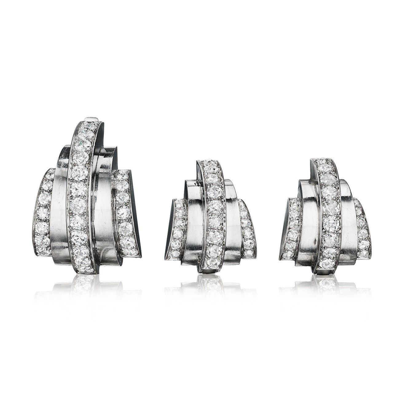 Comprising a pair of ear clips and a clip, each of rounded stepped design, set with old-, circular-, and single-cut diamonds, mounted in platinum, ear clips with clip back fittings, each with French assay and maker's mark for Georges Arfvidson & Cie.