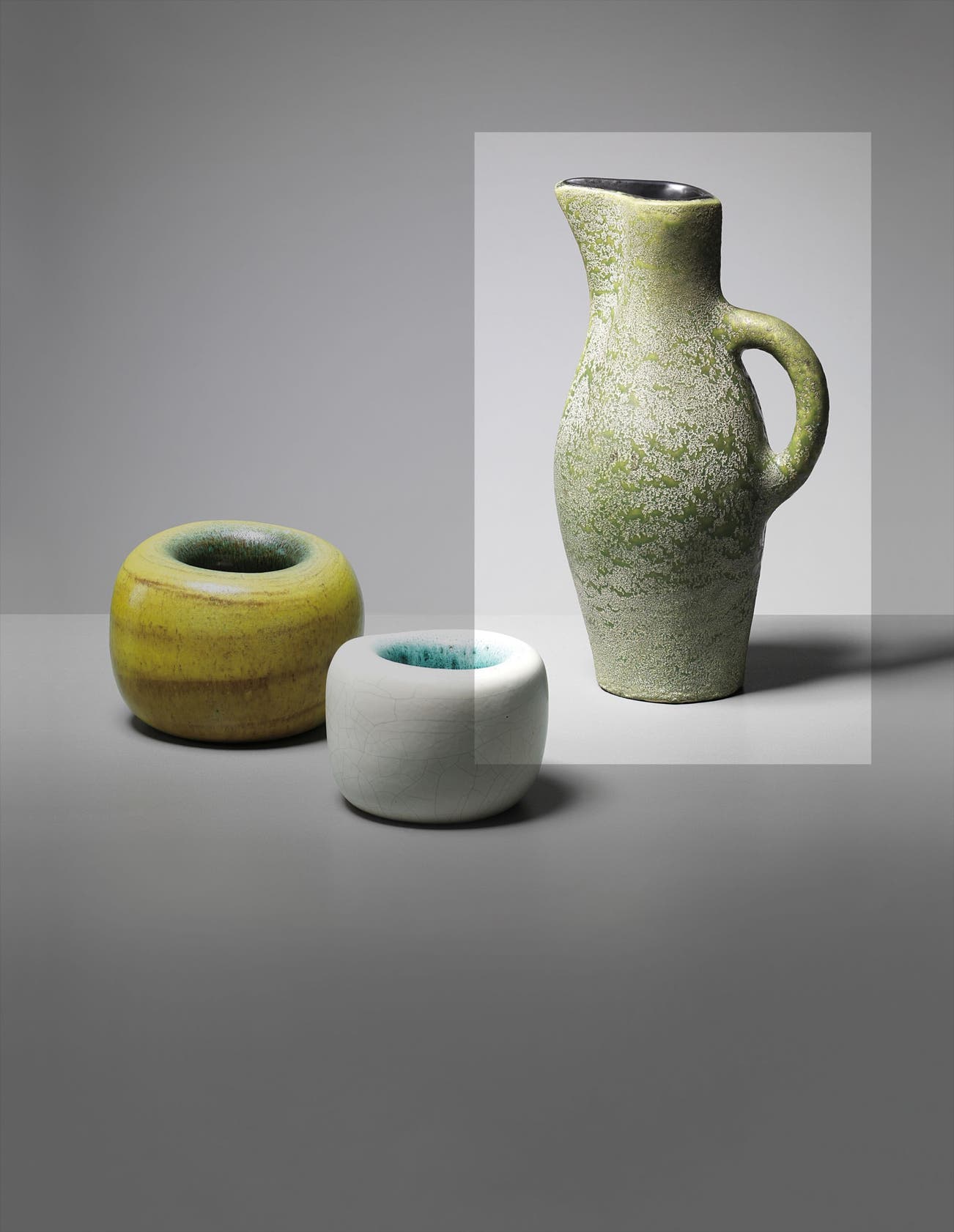 French | B. 1910 D. 1964Working out of his studio in Paris (and later in Aix-en-Provence), Georges Jouve produced sculptural ceramics for modernist interiors. Upon the invitation of Jacques Adnet, the director of the Compagnie des Arts Français (CAF), Jouve participated in various salons internationally and within France, including the Salon des Artistes Décorateurs. He created rigorously simple yet soft and playful forms, including plump, contrapposto vessels, rotund pitchers and cylindrical vases. His tireless experimentation of glazes led to a palette of perfect matte blacks, bone whites and joyful pops of lime green, lemony yellow and, occasionally, selenium red. Jouve's ceramics echo the organic modernism of his CAF colleagues, such as Charlotte Perriand and Serge Mouille.