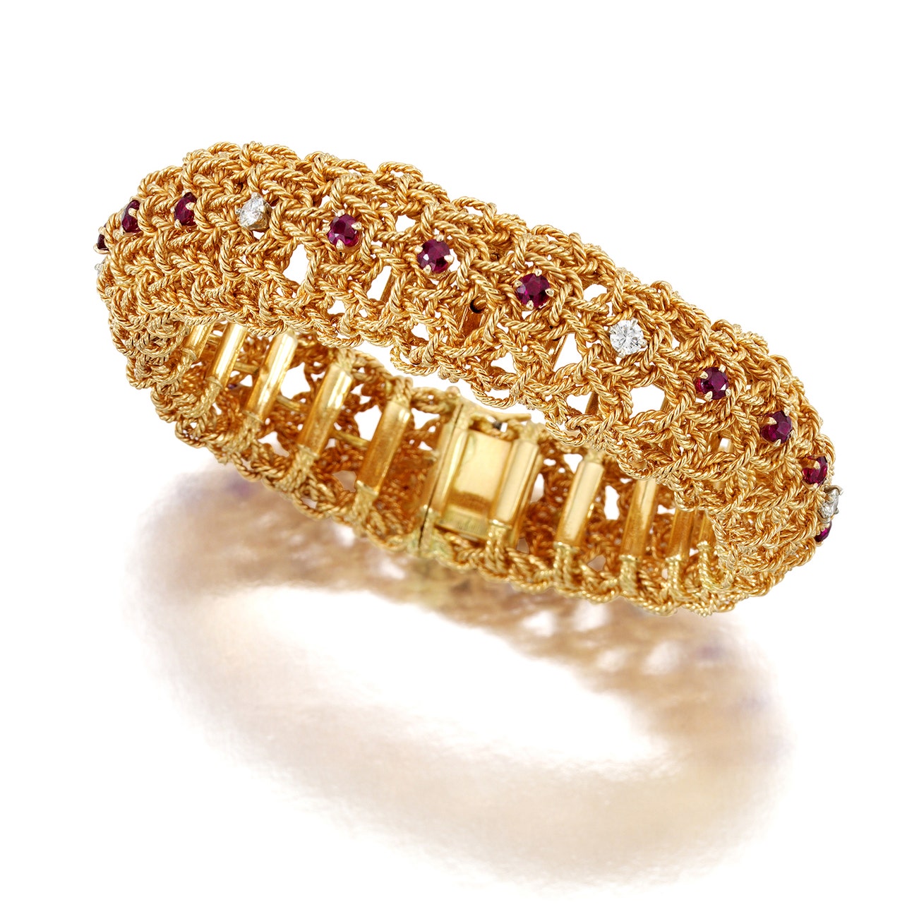 Of flexible construction, set with round-shaped rubies, accented by brilliant-cut diamonds, mounted in 18K yellow gold, length approximately 6 1/2 inches, with French assay marks for gold, and maker's mark for Georges Lenfant.