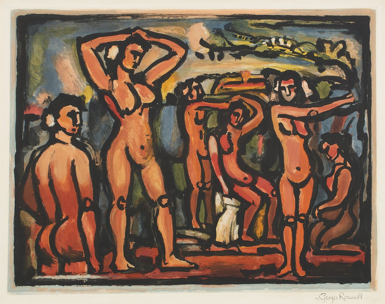 Automne is Rouault's tour-de-force print and amongst his most colorful, technically complex and largest. It is also a precursor to the large aquatints by Picasso and Matisse made later in the 1950s and 1960s with the master printmaker.