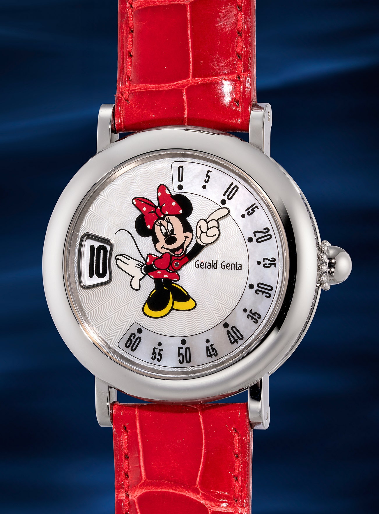 - The present Gérald Genta Retro Fantasy encased in a 36mm case is one of the largest variants from the brand's Retro Fantasy series. Notably, this particular example displays the rare depiction of Minnie Mouse, rather than the more common Mickey Mouse motif. Minnie's left hand serves as the retrograde minute hand, a distinctive design element synonymous with Gérald Genta's watches.