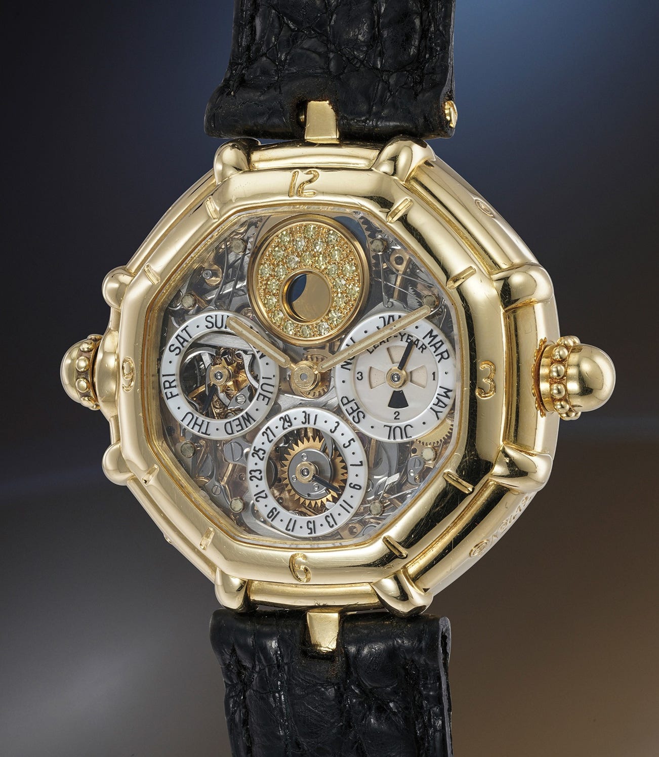 A very attractive and rare yellow gold octogonal skeletonized minute repeating perpetual calendar wristwatch with leap year indication and moonphase display