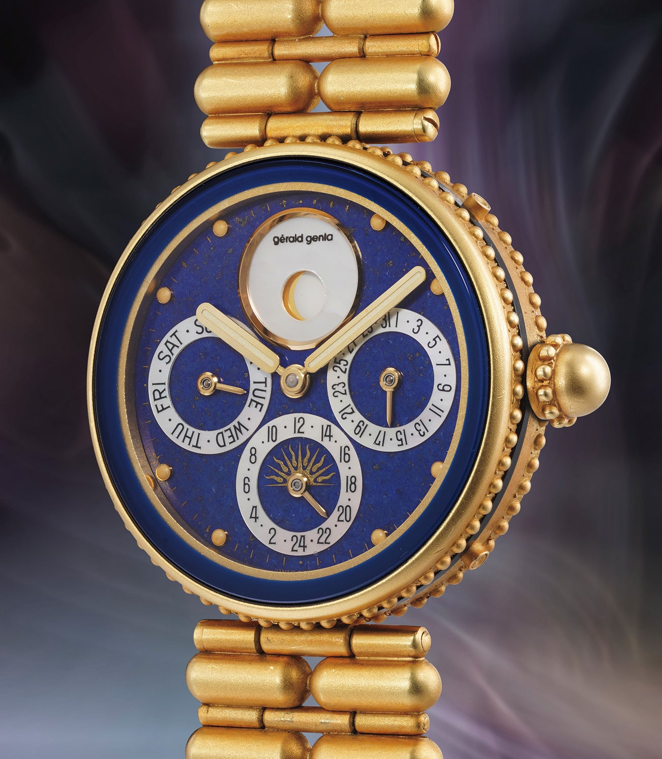Preserved in excellent overall condition, featuring strong hallmarks with a beautiful lapis and mother of pearl dial, the present Gerald Génta Gefica is certainly a must have for the discerning collector of unique and fascinating timepieces.