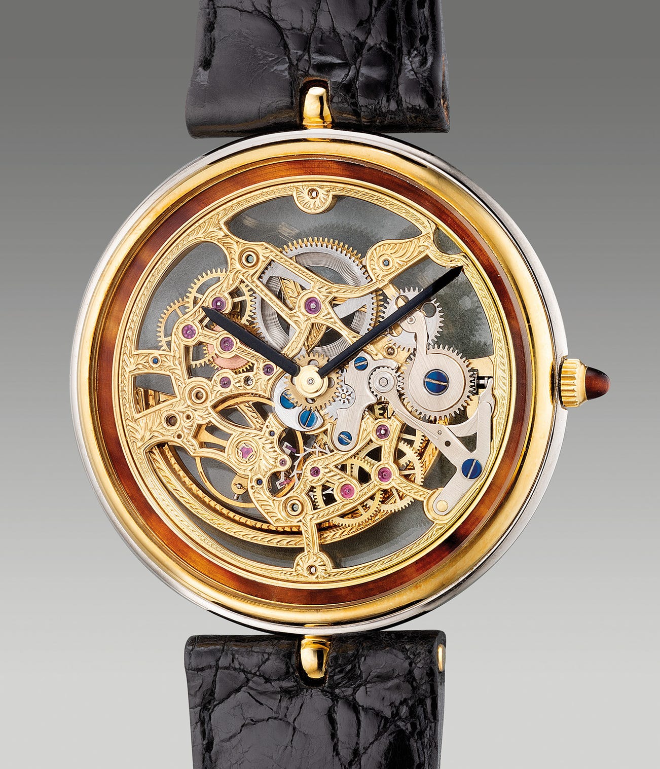 A fine two-tone yellow gold and white gold skeletonized wristwatch with tortoise shell outer minute track inlay