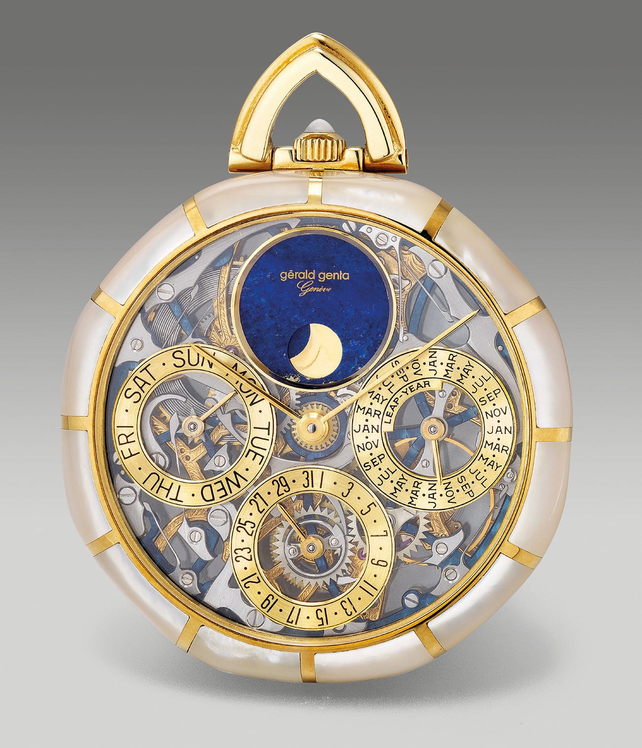 With a synonymous style of the 1980s, the present Gerald Genta “Royama” pocket watch might just be the perfect example which reflects the style of its era. Encased in a yellow gold and mother of pearl embossed octagonal-shaped case, the present pocket watch draws immediate attention of collectors of fine timepieces. Mostly referred as the genius who designed the Royal Oak and the Nautilus, many may not be aware that Gerald Genta is much more than that. Having established his career in the watch industry in the early 1950’s, his first design was the Universal Genève SAS Polerouter which was introduced to commemorate the historic flight from Copenhagen to Los Angeles via the North Pole in 1954. In 1972, the famous Audemars Piguet Royal Oak was launched making it one of the largest milestones of Genta’s career and a new era to horology.
