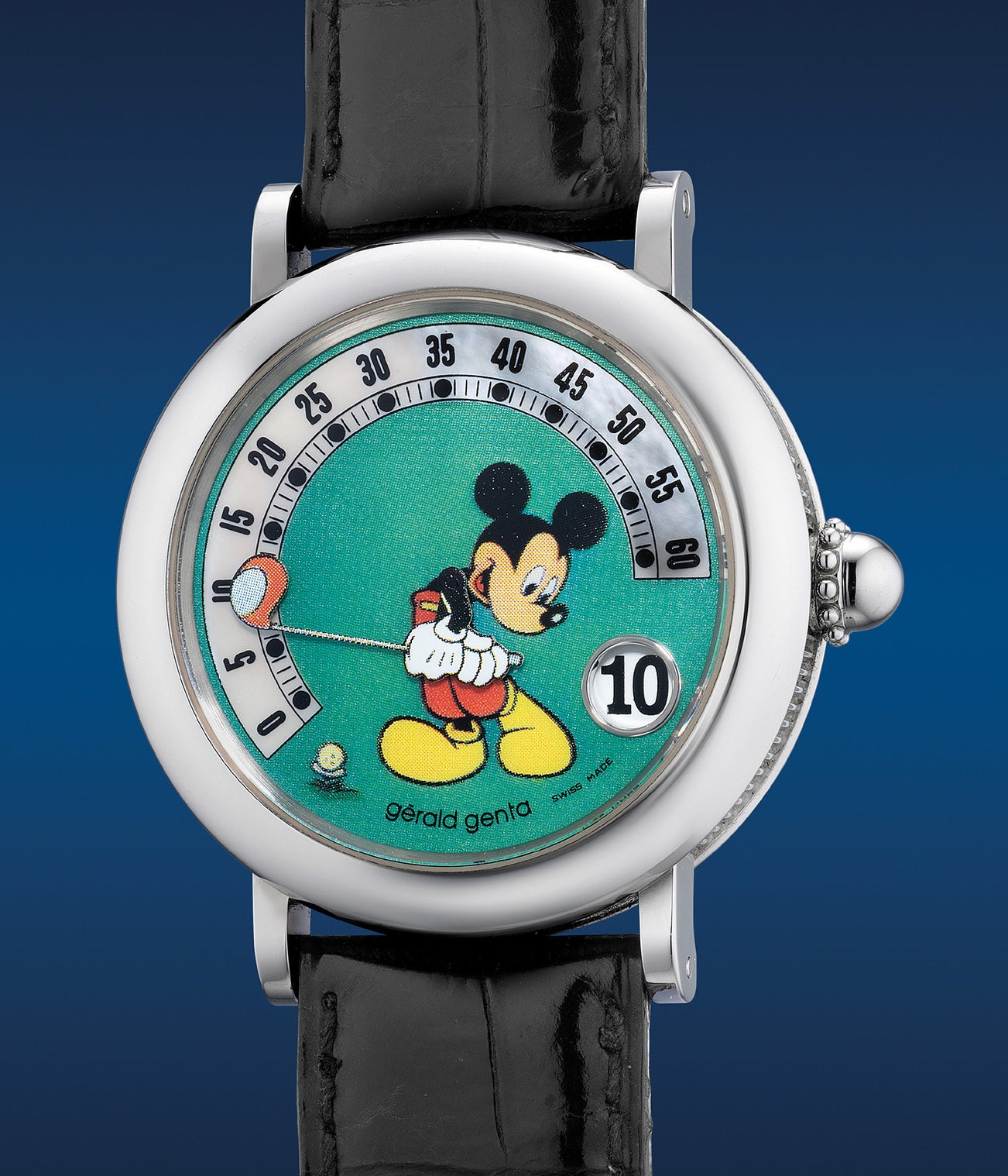 With a recent spike in demand for early Gérald Genta timepieces, the community has witnessed a growing appetite for the Retro “Mikey Mouse” collection. In the 1980s, Genta won the rights to produce timepieces to celebrate Walt Disney and cartoon characters from Mickey Mouse series. Since then, these rare timepieces have been produced with various dial designs as well as case materials. The present Retro “Mickey Mouse” is an instant classic encompassing the whimsical mouse swinging a golf club articulated as the indication of its retrograde style minutes. An aperture at the 4 o’clock position features a jumping hour sums up the style of the Genta Retro. With a teal colored dial contrasted against the mother-of-pearl minute track, the appeal is simply vibrant and playful. A delight to view as Mickey swings his golf club across the retrograde minute track, the hour jumps simultaneously once he hits the golf ball for a birdie. Preserved in excellent overall condition the present timepiece is accompanied with its original warranty and full set of accessories.