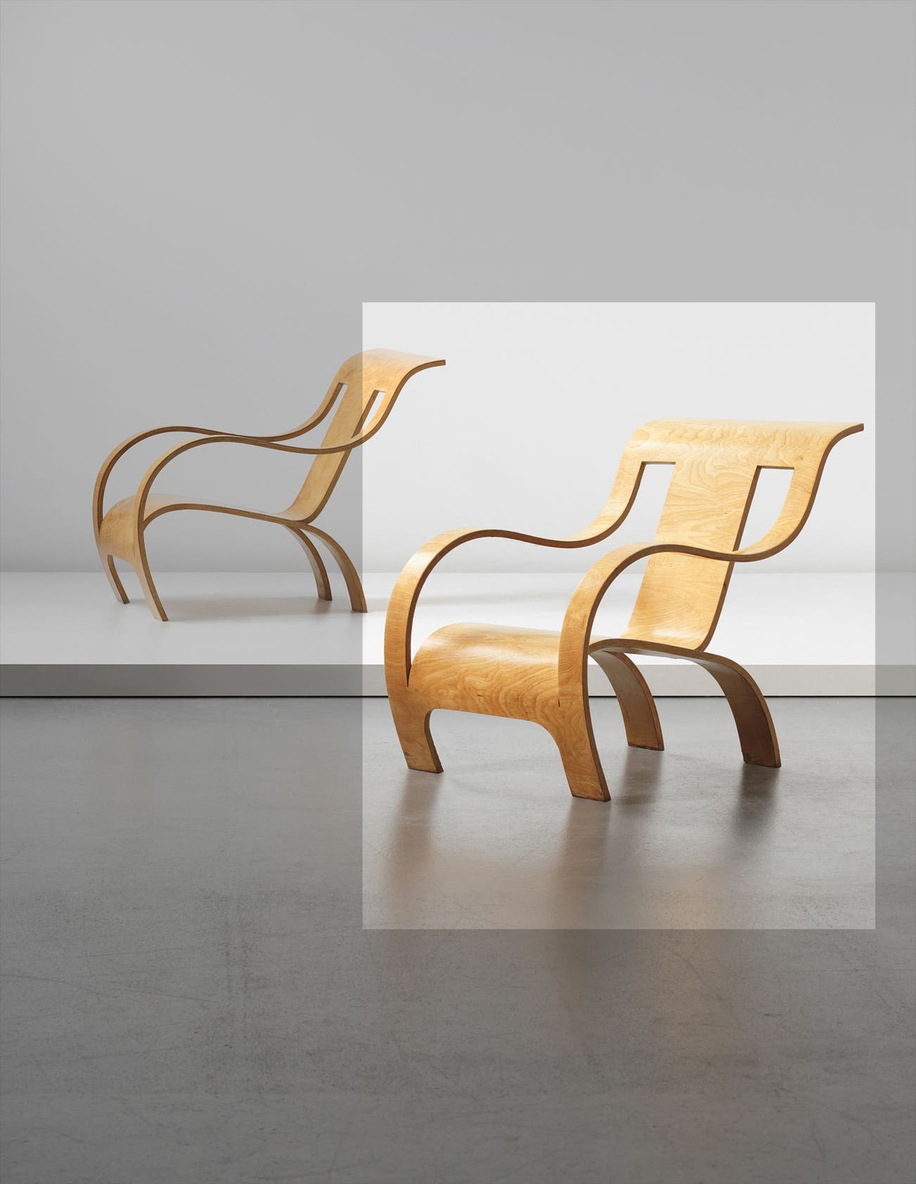 The present and following lots are two of the 120 examples manufactured by Summers’s company, Makers of Simple Furniture Ltd. beginning in 1934. Each chair was constructed out of a single plywood sheet of thirteen layers of cross-grained veneer which was cut, pressed and cut again. This elegantly simple process produced a chair that was comfortable enough to sit in without a cushion. Ultimately the manufacture was too costly to compete with Scandinavian imports and production ceased in 1939.