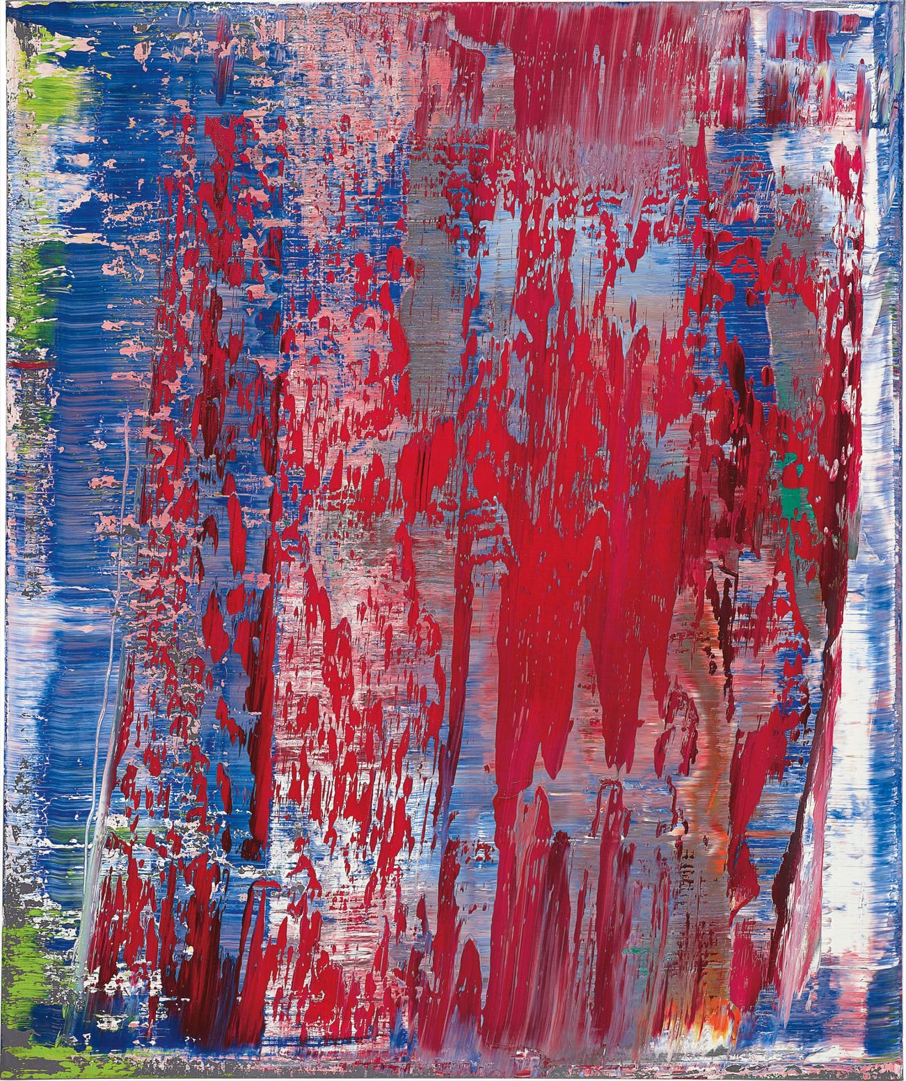 Richter achieves each abstract picture through a uniquely restrained process, and the harmony of the present lot glows with mesmerizing abandon. Hints of lucid green, cherry blossom pink, and slate grey poke through a secondary layered veil of royal blue and brilliant white. Delicate in its translucence, it is tucked beneath the overarching wash of red masking the canvas. The kaleidoscopic surface both reveals and conceals a myriad of layers, colors and illusions. The liquid surface of the canvas, applied in waves of viscous pigment, belies a view of some unknown landscape, spotted with withering rays from the setting sun. Richter’s rhythm of painting on the canvas gives way to inherent movement in the picture.
