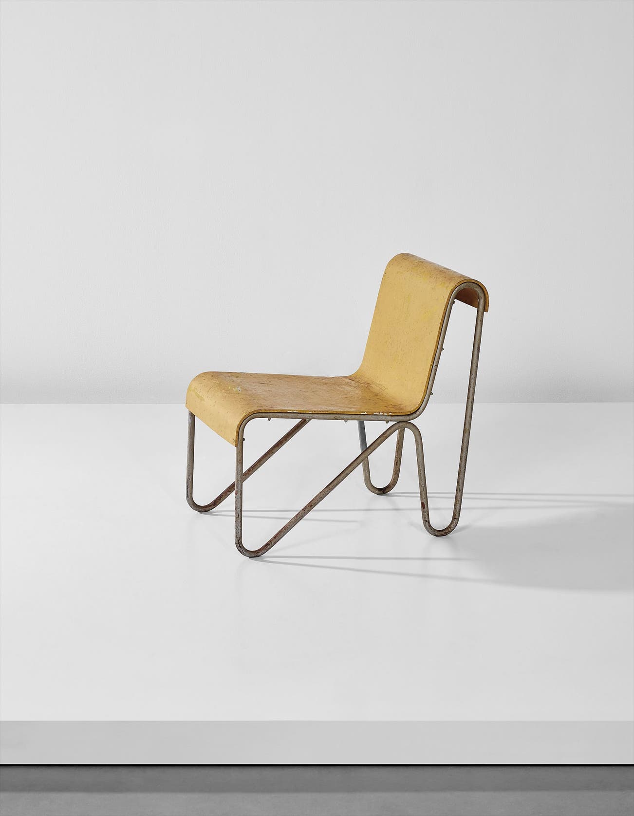 The real innovation in Rietveld’s Beugel chair however was not found in the frame but in the undulating seat and backrest. Arguably, Rietveld was the first modern designer to develop a one-piece seating shell, predating Alvar Aalto’s experiments. For the initial prototypes of the Beugel chair, Rietveld used solid steel rod for the frame and seat sections out of Vulkanfber: an industrial fibreboard that could be shaped after being soaked in water and (more or less) kept its form when dried. Given his interest for unconventional materials in cabinet making, Rietveld immediately saw the potential of this fibre composite that was mainly used for the production of cheap imitation-leather suitcases. In 1928, the Beugel chair made its international debut in Stuttgart at the ‘Der Stuhl’ exhibition where it was picked up quickly by the international press, which commented on the groundbreaking seating shells. But it was not until 1930-1931 that the Beugel chair was taken into production by the avant-garde department store Metz & Co, in a version with tubular steel frames and plywood seat sections such as the present lot.