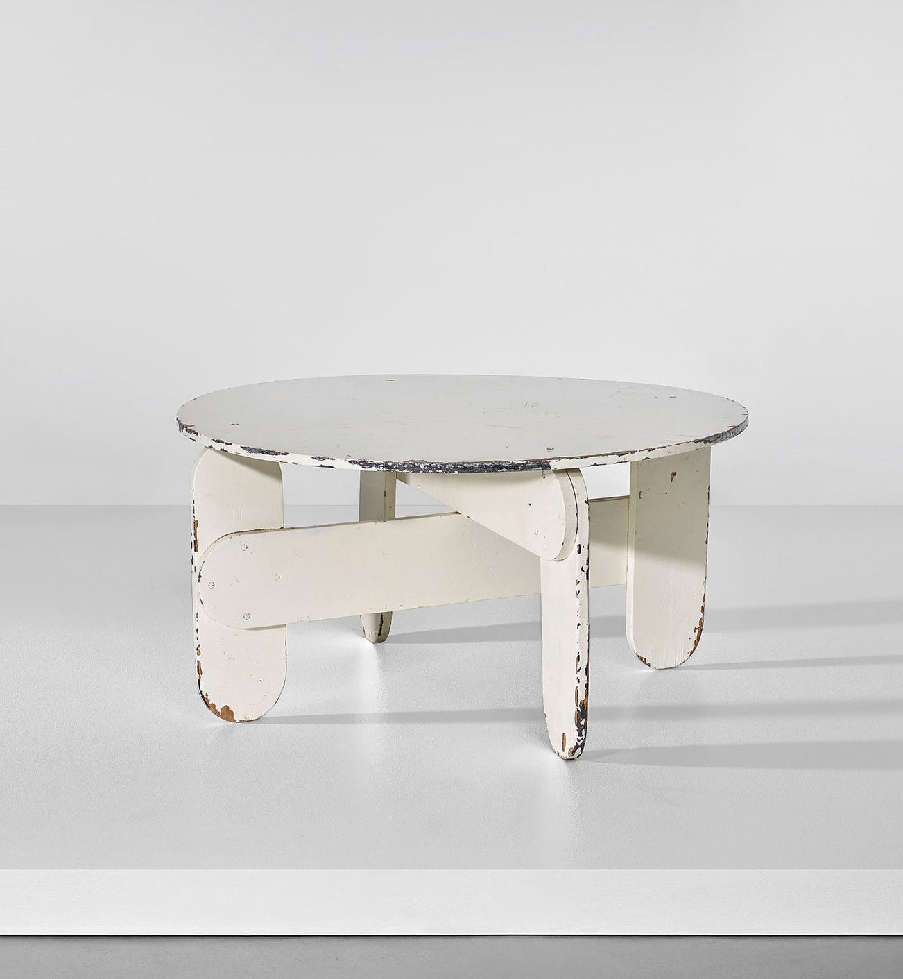 Given his approach, the present table is sophisticated despite its relatively basic form. Although the base of crossed boards echoes the crate designs, the rounded edges give it a playful twist. Rietveld first applied this idea in a series of low chairs similar to the “Beugel” chair design, with wooden bases instead of the customary tubular steel frames, the rounded edges of the planks fitting neatly into the curves of the undulating plywood seats. One of these low wooden “Beugel” chairs is recorded in Rietveld’s private apartment and a set of these chairs with a matching small high table, similar to the present larger low table, is in the collection of the Stedelijk Museum. Although Rietveld never designed a specific table for his "Beugel" chairs, it is not surprising that these two tables became known as “Beugeltafels.”