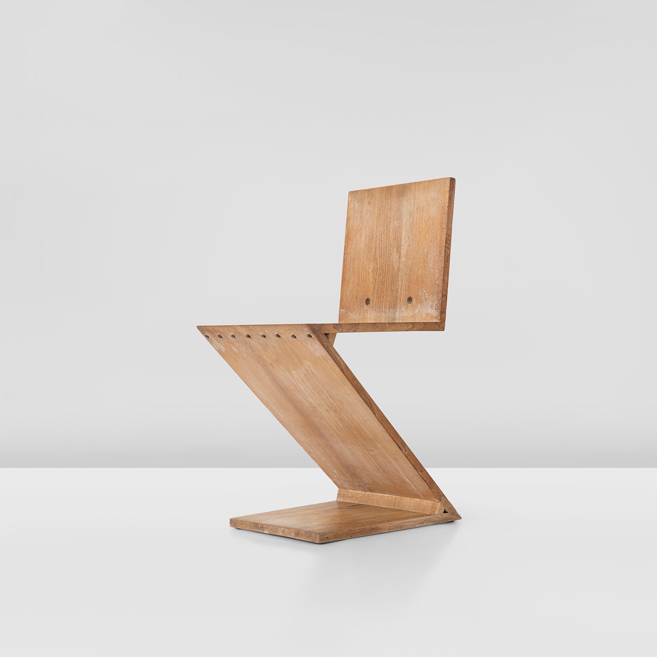 Whilst never achieving Rietveld's initial aim of producing a chair from a single, continuous piece of material, the 'Zig-Zag' chair, complete with its inventive reinforcing mechanisms, was one of the earliest structurally sound cantilevered chairs, and in its wood form, presented a progressive departure from the dependence on metal frames in the examples by Mies van der Rohe and Marcel Breuer. Whilst later variations of the model including lacquered versions in white, red, and green, the present chair comprises the 'Zig-Zag' in its purest form: the “rough” and “unsullied” exposed elmwood version which, according to Rietveld’s apprentice, carpenter Gerard van de Groenekan, was the designer’s preferred version of his most celebrated design.