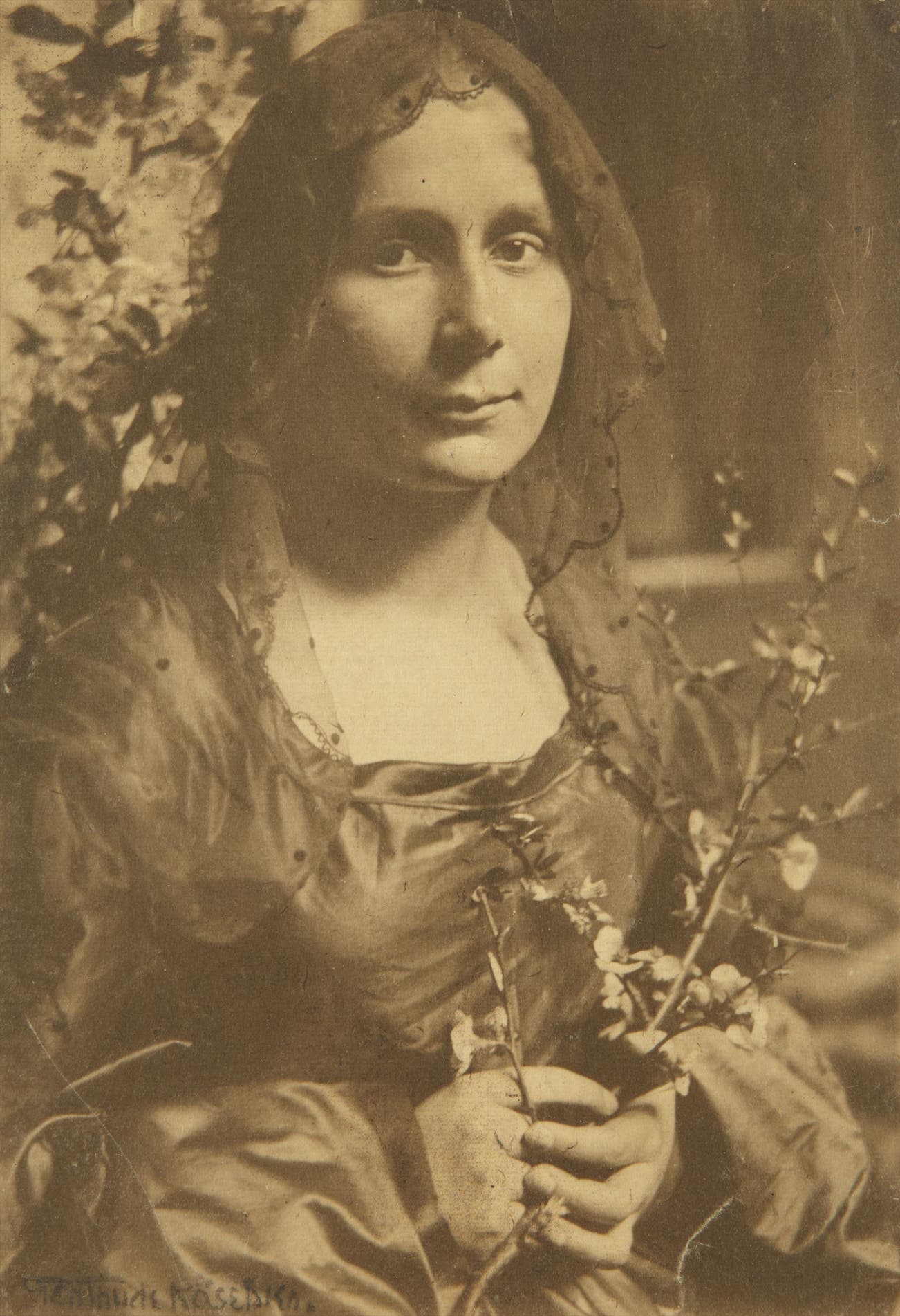 Cornelia Montgomery, full face, holding flowers, square-necked gown