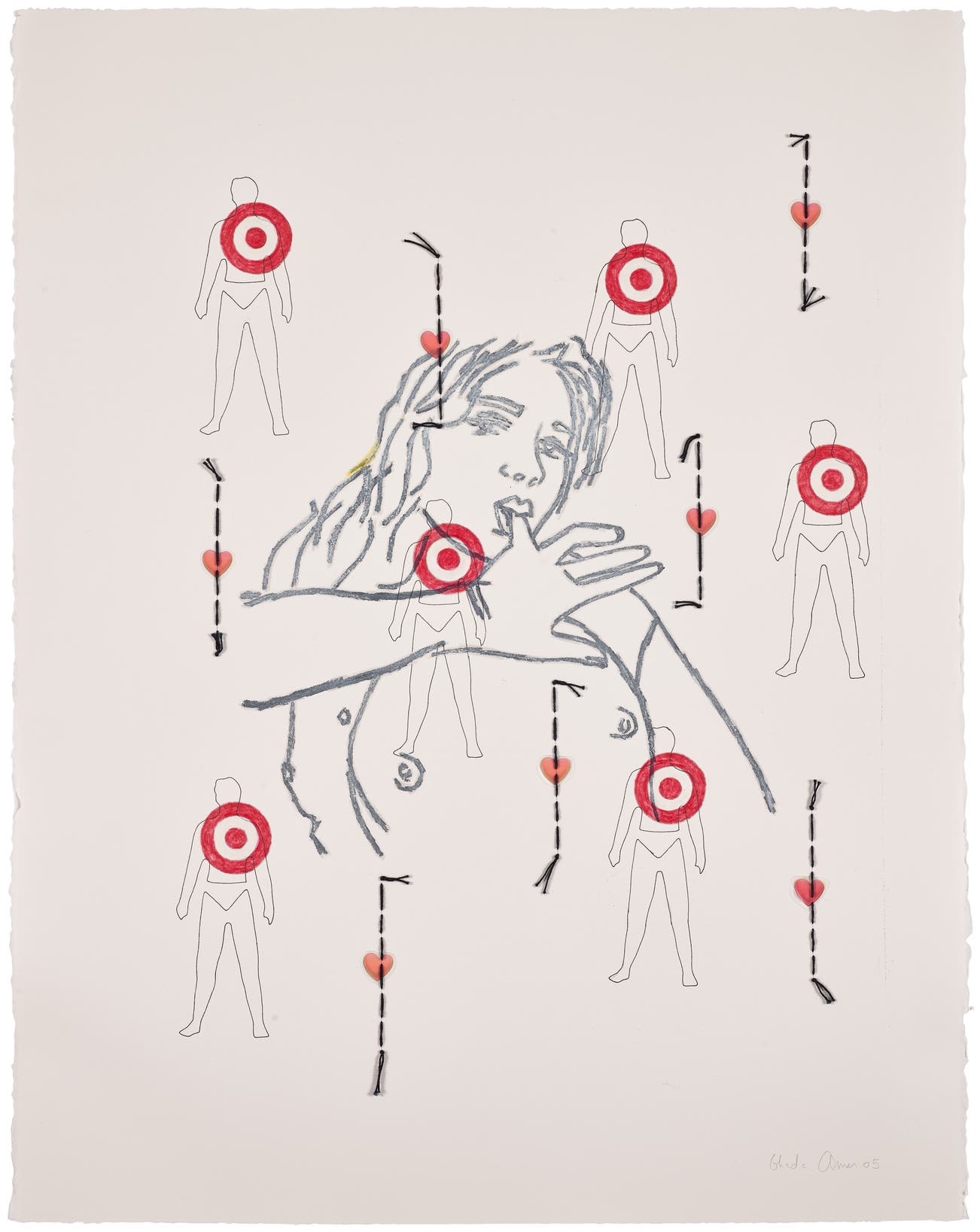 ink, crayon, stickers and embroidery on paper