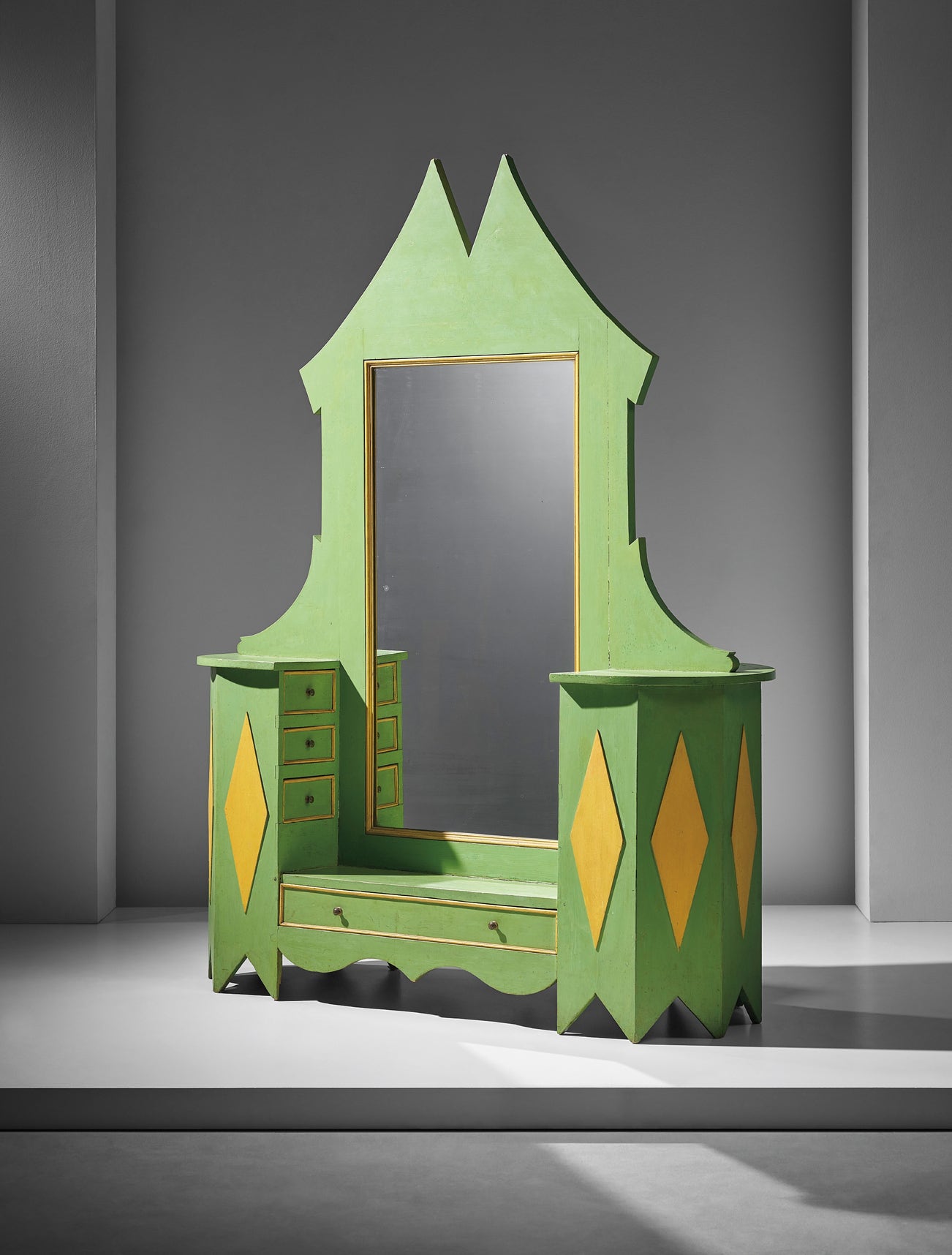 By 1918, the year of the present lot’s conception, Balla’s experiments with utilitarian objects took off, and he channelled his Futurist notions into designs for a vast range of utilitarian objects which included vases, lampshades, placemats, Futurist chairs, jointed furniture and the present cabinet. The majority of these designs were ultimately produced. In his 1918 visualisations of an interior his ambitions for the conception of space are evident. The design illustrated here specifies that Futurist paintings are to be spaced out between walls decorated with angular Futurist forms; another design from the same year places a lamp amidst the intersecting forms and lines. Balla desired to eliminate the boundaries between canvas, wall decoration and functional design. His legacy is both a metaphor for the ambitions of the Futurist movement and the precursor to growing modernist notions. With the present lot, Balla undertook to challenge ‘decorative art’ with representations of modern technology, uniting the visual with the functional.