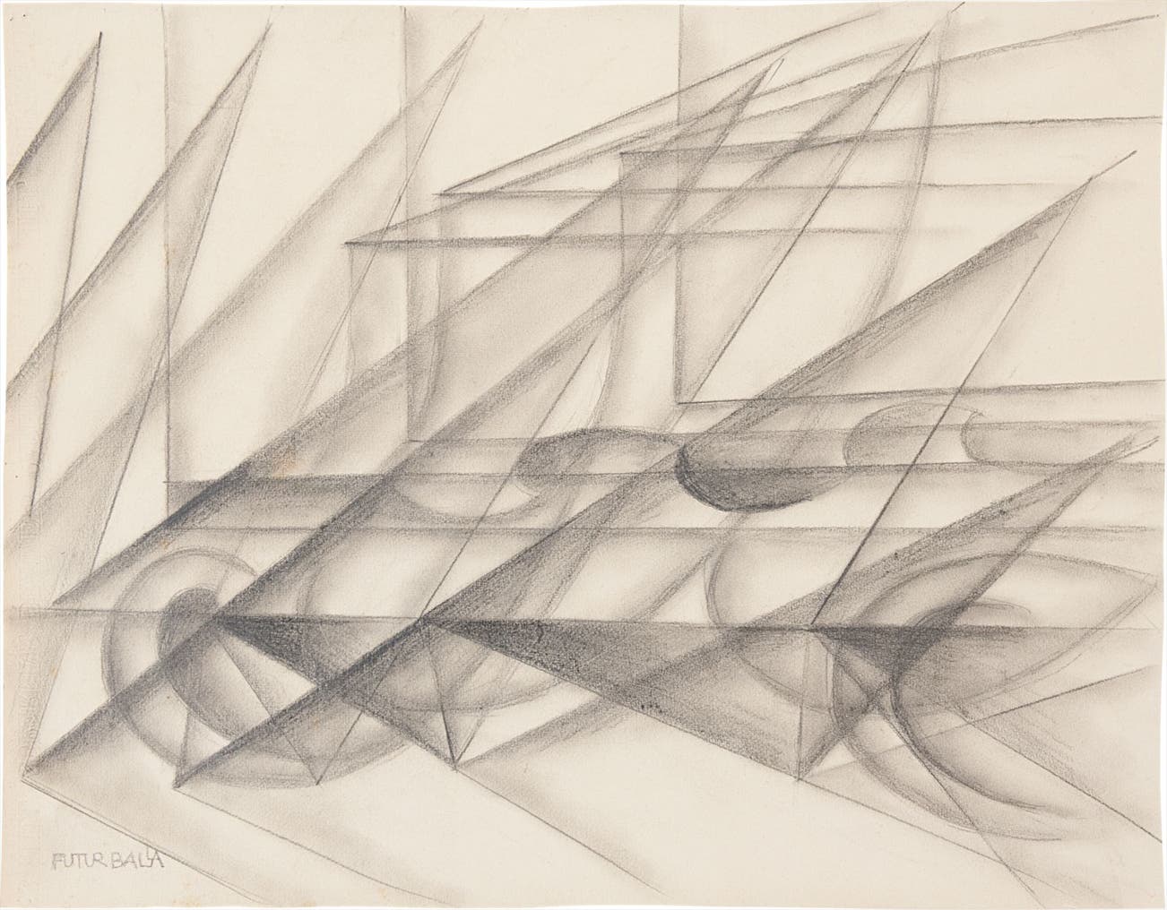 The present work belongs to the experimental series that Balla dedicated to racing cars in 1913. Like other comparable works, it is painted in monochrome. Maurizio Fagiolo discussed this particularity in 1968: ‘the Velocità di automobili (a car more beautiful than the Nike of Samothrace…). Balla starts from scratch; he removes colour as the plastic fact is what interests him. He pairs the analysis of motion with the analysis of noise and speed that operate within the atmosphere, slicing and dissecting it. This sequence has no beginning and no end. There is not only the car's speed, but our emotion in capturing that speed’ (Compenetrazioni iridescenti, Rome, 1968, p.17). In a page from his notebook, where Balla works on one of his first depictions of racing cars, he writes: ‘everything is abstracted through equivalents/that from their starting point/go to the infinity’. Through this, the viewer takes on the speed of the accelerating car, deprived of its driver, in a gradient of lines from right to left.