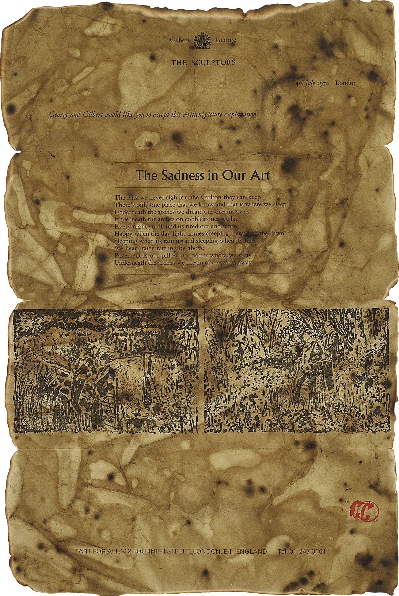 Letterpress and line block print, on dyed and individually burnt paper, contained in the original letterpress envelope.